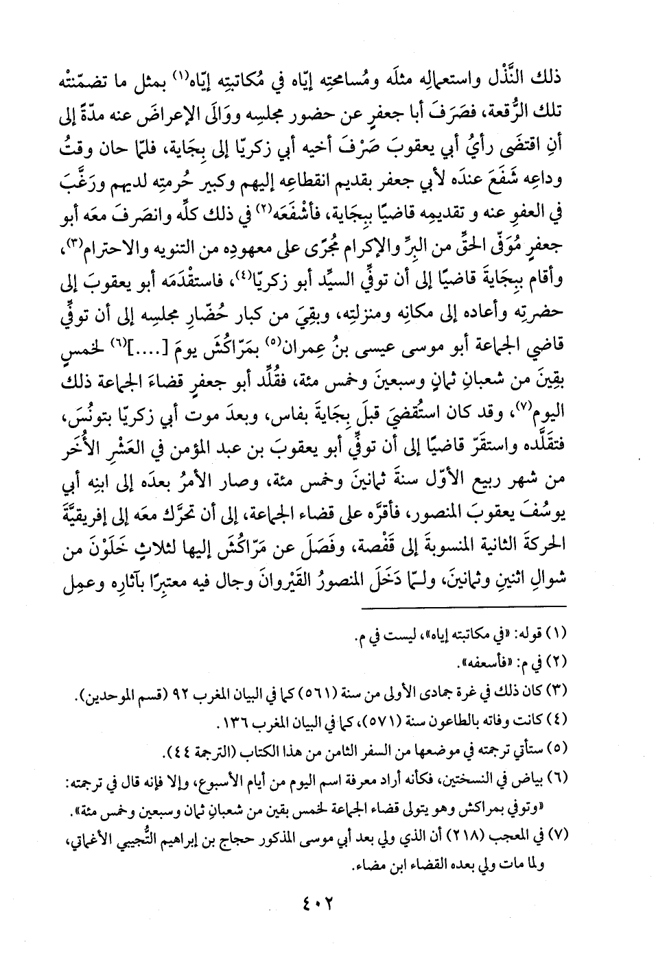 ذلك النَّذْل واستعمالِه مثلَه ومُسامحتِه إيّاه في مُكاتبتِه إيّاه (¬1) بمثل ما تضمّنتْه تلك الرُّقعة، فصَرَفَ أبا جعفرٍ عن حضور مجلسِه ووالَى الإعراضَ عنه مدّةً إلى أنِ اقتضَىِ رأيُ أبي يعقوبَ صَرفَ أخيه أبي زكريّا إلى بِجاية، فلمّا حان وقتُ وداعِه شَفعَ عندَه لأبي جعفر بقديم انقطاعِه إليهم وكبير حُرمتِه لديهم ورَغَّبَ في العفوِ عنه وتقديمِه قاضيًا ببِجاية، فأشْفَعَه (¬2) في ذلك كلِّه وانصَرفَ معَه أبو جعفرٍ مُوَفّى الحقِّ من البِرِّ والإكرام مجُرًى على معهودِه من التنويه والاحترام (¬3)، وأقام ببِجايةَ قاضيًا إلى أن توفِّي السيِّد أبو زكريّا (¬4)، فاستقْدَمَه أبو يعقوبَ إلى حضرتِه وأعاده إلى مكانِه ومنزلتِه، وبقِيَ من كبار حُضّارِ مجلسِه إلى أن توفِّي قاضي الجماعة أبو موسى عيسى بنُ عِمران (¬5) بمَرّاكُشَ يومَ [...] (¬6) لخمسٍ بقِينَ من شعبانِ ثمانٍ وسبعينَ وخمس مئة، فقُلِّد أبو جعفرٍ قضاءَ الجماعة ذلك اليوم (¬7)، وقد كان استُقضيَ قبلَ بِجايةَ بفاس، وبعدَ موت أبي زكريّا بتونُسَ، فتقَلَّده واستقَرّ قاضيًا إلى أن توفِّي أبو يعقوبَ بن عبد المؤمن في العَشْرِ الأُخر من شهر ربيع الأوّل سنةَ ثمانينَ وخمس مئة، وصار الأمرُ بعدَه إلى ابنِه أبي يوسُفَ يعقوبَ المنصور، فأقرَّه على قضاء الجماعة، إلى أن تحرَّك معَه إلى إفريقيَّةَ الحركةَ الثانية المنسوبةَ إلى قَفْصة، وفَصَلَ عن مَرّاكُشَ إليها لثلاثٍ خَلَوْنَ من شوالِ اثنينِ وثمانينَ، ولمّا دَخَلَ المنصورُ القَيْروانَ وجال فيه معتبِرًا بآثارِه وعمِل