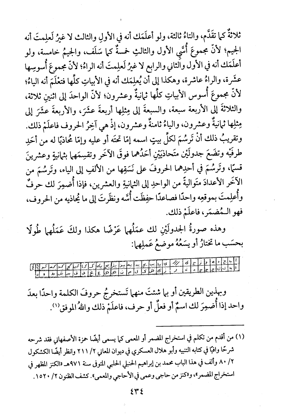 ثلاثةٌ كما تقَدَّم، والتاءُ ثالثة، ولو أعلَمَك أنه في الأولِ والثالث لا غيرُ لَعلِمتَ أنه الجيم؛ لأنَّ مجموعَ أُسَّي الأول والثالثِ خمسةٌ كما سَلَف، والجيمُ خامسة، ولو أعلمك أنه في الأول واَلثاني والرابع لا غيرُ لَعلِمتَ أنه الراءُ؛ لأنَّ مجموعَ أُسوسِها عشَرة، والراءُ عاشرة، وهكذا إلى أن يُعلِمَك أنه في الأبياتِ كلِّها فتعْلَمَ أنه الياءُ؛ لأنَّ مجموعَ أُسوس الأبياتِ كلِّها ثمانية وعشرون؛ لأنَّ الواحدَ إلى اثنينِ ثلاثة، والثلاثةَ إلى الأربعة سبعة، والسبعةَ إلى مِثلِها أربعةَ عشَرَ، والأربعةَ عشَرَ إلى مِثلِها ثمانيةٌ وعشرون، والياءُ ثامنةٌ وعشرون، إذْ هي آخِرُ الحروف فاعلَمْ ذلك. وتقريبُ ذلك أنْ تَرسُمَ لكلِّ بيتٍ اسمه إمّا تحتَه أو عليه وإمّا محُاذيًا له من أحَدِ طرفَيْه وتضَعَ جدولَيْن متَحاذيَيْنِ أحَدُهما فوقَ الآخَر وتقسِمَهما بثمانيةٍ وعشرينَ قسمًا، وتَرسُمَ في أحدِهما الحروفَ على نَسَقِها من الألفِ إلى الياء، وتَرسُمَ من الآخَر الأعدادَ متَواليةً من الواحدِ إلى الثمانيةِ والعشرين، فإذا أُضمِرَ لك حرفٌ وأُعلِمتَ بموقعِه واحدًا فصاعدًا حفِظَت أُسَّه ونظَرتَ إلى ما يُحاذيه من الحروف، فهو المُضمَر، فاعلَمْ ذلك.