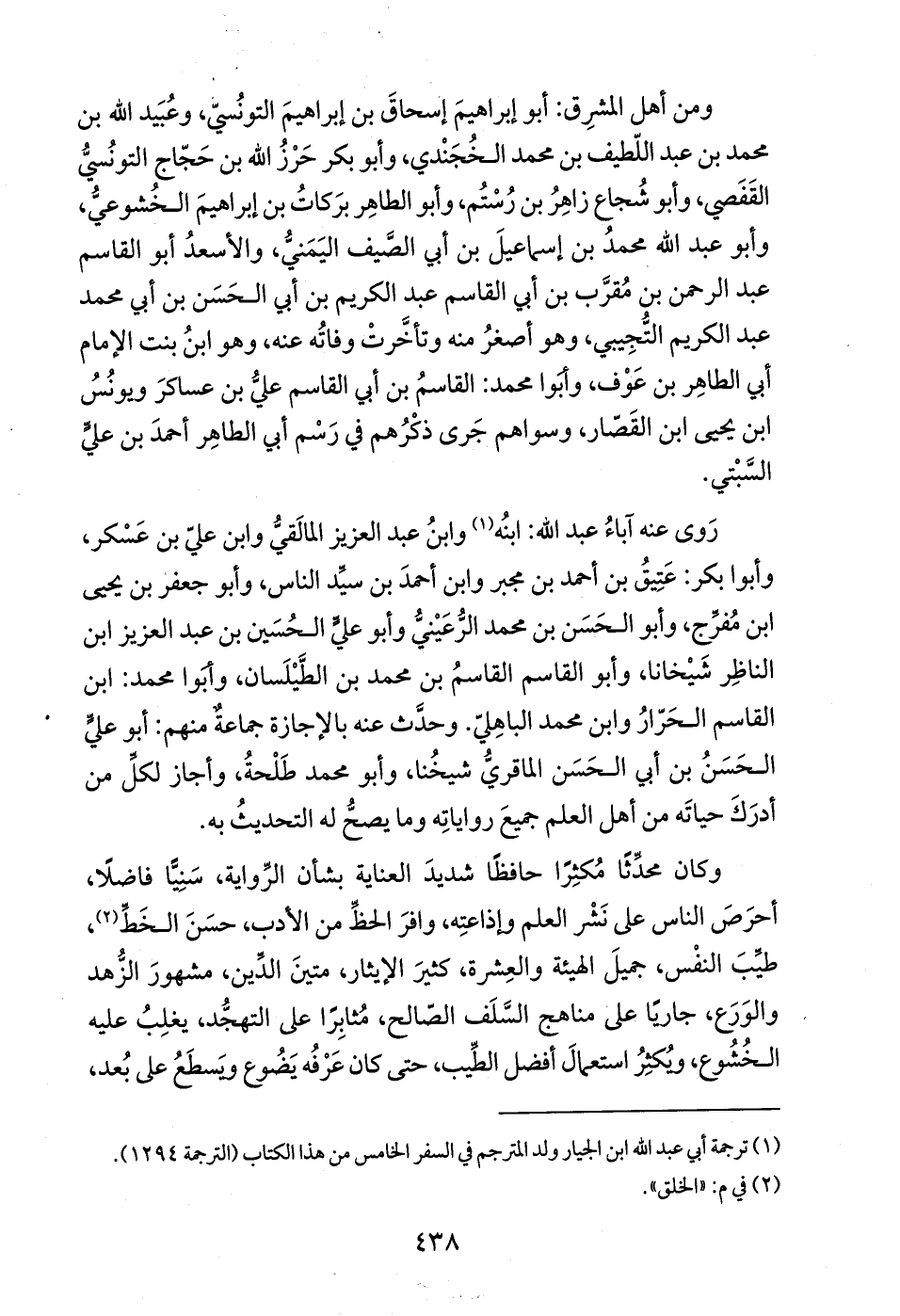 وكان محدِّثًا مُكثِرًا حافظًا شديدَ العناية بشأن الرِّواية، سَنِيًّا فاضلًا، أحرَصَ الناس على نَشْر العلم وإذاعتِه، وافرَ الحظِّ من الأدب، حسَنَ الخَطِّ (¬2)، طيِّبَ النفْس، جميلَ الهيئة والعِشرة، كثيرَ الإيثار، متينَ الدِّين، مشهورَ الزُّهد والوَرَع، جاريًا على مناهج السَّلَف الصّالح، مُثابِرًا على التهجُّد، يغلِبُ عليه الخُشُوع، ويُكثِرُ استعمالَ أفضل الطِّيب، حتى كان عَرْفُه يَضُوع ويَسطَعُ على بُعد،