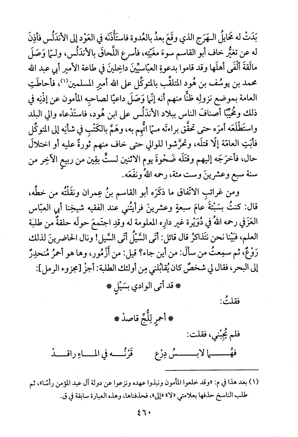 بَدَتْ له مَخايلُ الهَرَج الذي وقَعَ بعدُ بالعُدوة فاستَأْذَنه في العَوْد إلى الأندَلُس فأذِنَ له عن تغيُّر خاف أبو القاسم سوءَ مغَبّتِه، فأسرع اللَّحاقَ بالأندَلُس، ولمّا وَصَلَ مالَقةَ ألْفَى أهلَها وقد قاموا بدعوةِ العبّاسيِّينَ داخِلينَ في طاعة الأمير أبي عبد الله محمد بن يوسُف بن هُود المتلقّب بالمتوكِّل على الله أمير المسلمين (¬1)، فأحاطَتِ العامة بموضع نزوله ظنًّا منهم أنه إنّما وَصَلَ داعيًا لصاحبِه المأمون عن إذْنِه في ذلك ومخُيِّبًا أصنافَ الناس ببلاد الأندَلُس على ابن هُود، فاستَدعاه والي البلد واستَطْلَعَه أمرَه حتى تحقَّق براءتَه ممَّا اتُّهِم به، وهَمَّ بالكَتْبِ في شأنِه إلى المتوكِّل فأبَتِ العامّة إلا قتلَه، وتحرَّشوا للوالي حتى خاف منهم ثورةً عليه أو اختلالَ حال، فأخرَجَه إليهم وقتَلَه ضَحوةَ يوم الاثنين لستٍّ بقِين من ربيعٍ الآخِر من سنة سبع وعشرينَ وست مئة، رحمه اللهُ ونفَعَه.