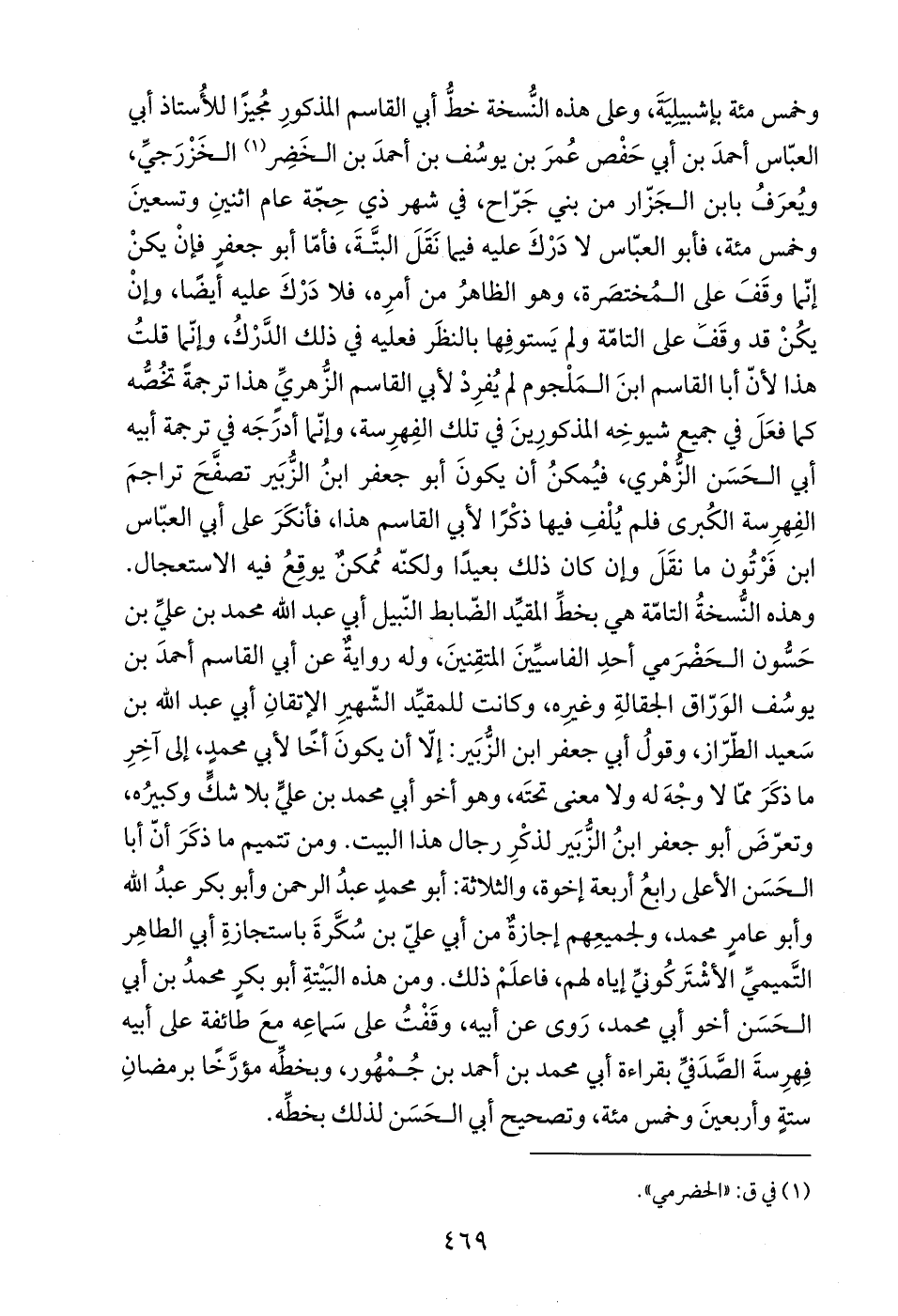 وهذه النُّسخةُ التامّة هي بخطِّ المقيّد الضّابط النّبيل أبي عبد الله محمد بن عليِّ بن حَسُّون الحَضْرَمي أحدِ الفاسيِّينَ المتقِنينَ، وله روايةٌ عن أبي القاسم أحمدَ بن يوسُف الوَرّاق الجقالةِ وغيره، وكانت للمقيِّد الشّهيرِ الإتقانِ أبي عبد الله بن سَعيد الطّرّاز، وقولُ أبي جعفر ابن الزُّبَير: إلا أن يكونَ أخًا لأبي محمدٍ، إلى آخِرِ ما ذكَرَ ممَّا لا وجْهَ له ولا معنى تحتَه، وهو أخو أبي محمد بن عليٍّ بلا شكٍّ وكبيرُه، وتعرّضَ أبو جعفر ابنُ الزُّبَير لذكْرِ رجال هذا البيت. ومن تتميم ما ذكَرَ أنّ أبا الحَسَن الأعلى رابعُ أربعة إخوة، والثلاثة: أبو محمدٍ عبدُ الرحمن وأبو بكر عبدُ الله وأبو عامرٍ محمد، ولجميعِهم إجازةٌ من أبي عليّ بن سُكَّرةَ باستجازةِ أبي الطاهِر التَّميميِّ الأشْتَركُونيِّ إياه لهم، فاعلَمْ ذلك. ومن هذه البَيْتةِ أبو بكرٍ محمدُ بن أبي الحَسَن أخو أبي محمد، رَوى عن أبيه، وقَفْتُ على سَماعِه معَ طائفة على أبيه فِهرِسةَ الصَّدَفيّ بقراءة أبي محمد بن أحمد بن جُمْهُور، وبخطّه مؤرَّخًا برمضانِ ستةٍ وأربعينَ وخمس مئة، وتصحيح أبي الحَسَن لذلك بخطِّه.