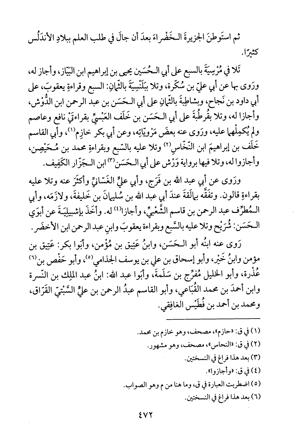 ورَوى عن أبي عبد الله بن فَرَج، وأبي علي الغَسّانيِّ وأكثَرَ عنه وتلا عليه بقراءةِ قالون. وتفَقَّه بمالَقةَ عندَ أبي عبد الله بن سُليمانَ بن خَليفةَ، ولازَمَه، وأبي المُطرِّف عبد الرحمن بن قاسم الشَّعْبيِّ، وأجازا (¬4) له. وأخَذَ بإشبيلِيَةَ عن أبوَي الحَسَن: شُرَيْح وتلا عليه بالسَّبع وبقراءة يعقوبَ وابنِ عبد الرحمن ابن الأخضَر.