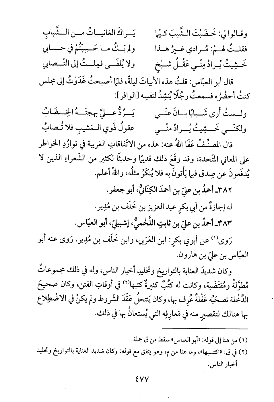 قال أبو العبّاس: قلتُ هذه الأبياتَ ليلةً، فلمّا أصبحتُ غَدَوْتُ إلى مجلس كنتُ أحضُرُه فسمعتُ رجُلاً يُنشِدُ لنفسِه [الوافر]: