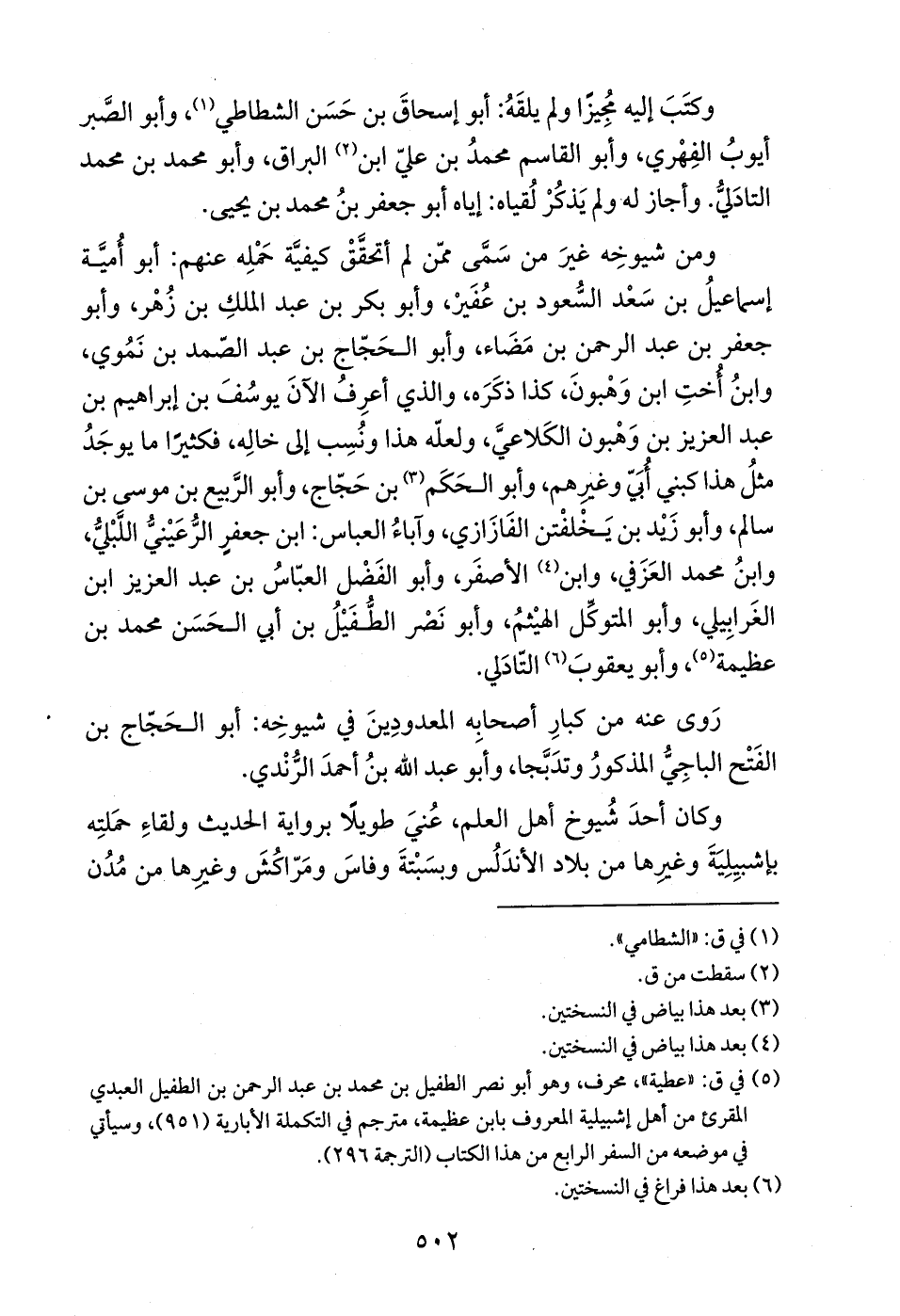 ومن شيوخِه غيرَ من سَمَّى ممّن لم أتحقَّقْ كيفيَّة حَمْلِه عنهم: أبو أُميَّة إسماعيلُ بن سَعْد السُّعود بن عُفَيرْ، وأبو بكر بن عبد الملكِ بن زُهْر، وأبو جعفر بن عبد الرحمن بن مَضًاء، وأبو الحَجّاج بن عبد الصّمد بن نَمُوي، وابنُ اختِ ابن وَهْبونَ، كذا ذكَرَه، والذي أعرِفُ الآنَ يوسُفَ بن إبراهيم بن عبد العزيز بن وَهْبون الكَلاعيَّ، ولعلّه هذا ونُسِب إلى خالِه، فكثيرًا ما يوجَدُ مثلُ هذا كبني أُبَيّ وغيرِهم، وأبو الحَكَم (¬3) بن حَجّاج، وأبو الرَّبيع بن موسى بن سالم، وأبو زيد بن يَخْلفْتن الفًازًازي، وآباءُ العباس: ابن جعفرٍ الرُّعَيْنيُّ اللَّبْليُّ، وابنُ محمد العَزَفي، وابن (¬4) الأصفَر، وأبو الفَضْل العبّاسُ بن عبد العزيز ابن الغَرابِيلي، وأبو المتوكِّل الهيْثمُ، وأبو نَصْر الطُّفَيْلُ بن أبي الحَسَن محمد بن عظيمة (¬5)، وأبو يعقوبَ (¬6) التّادَلي.