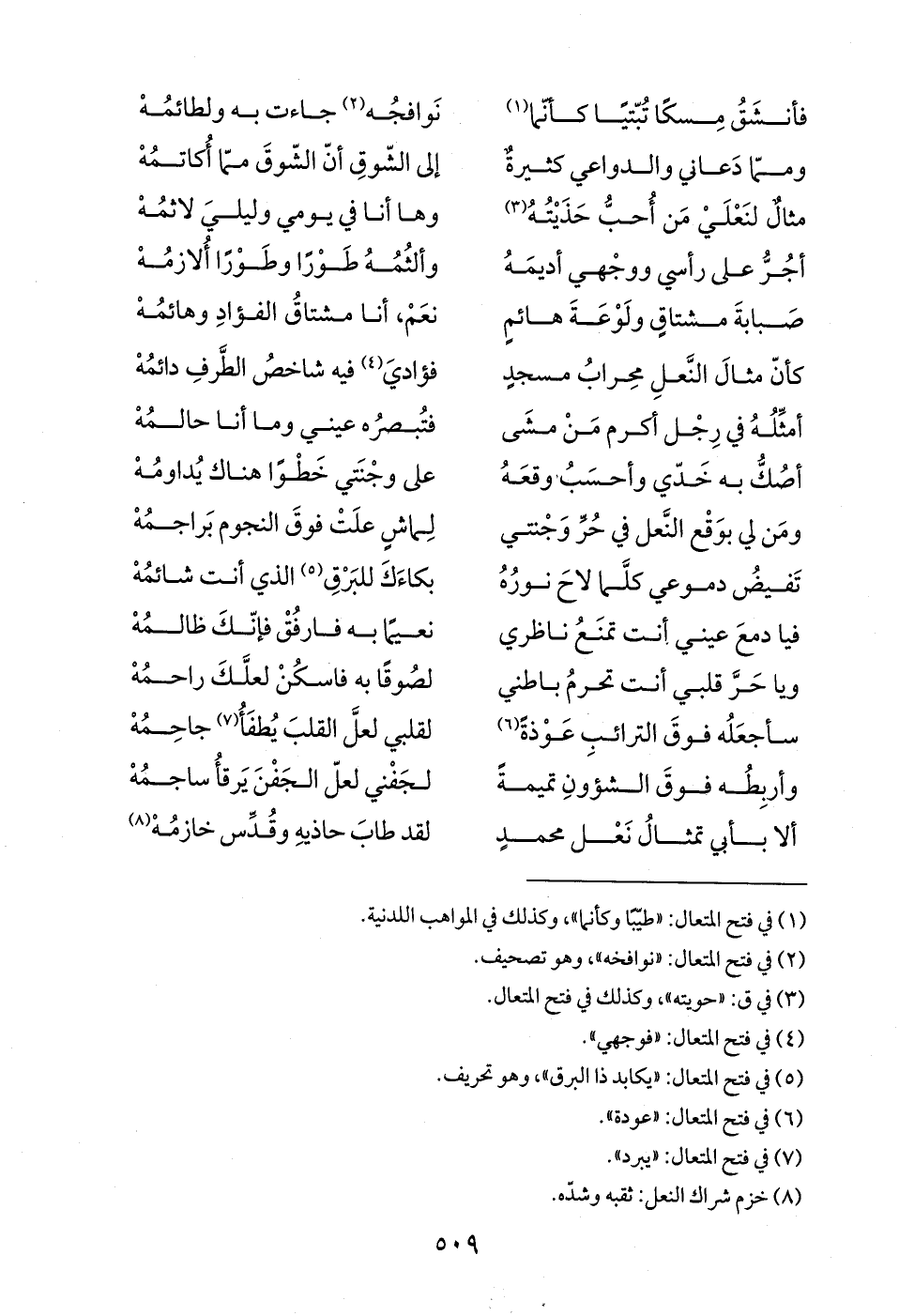 ألا بأبي تمثالُ نَعْل محمدٍ ... لقد طابَ حاذيهِ وقُدِّس خازمُهْ (¬8)
