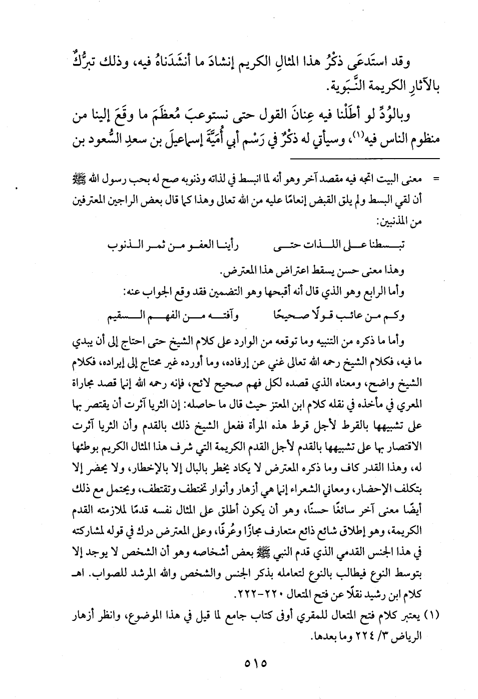 وأما ما ذكره من التنبيه وما توقعه من الوارد على كلام الشيخ حتى احتاج إلى أن يبدي ما فيه، فكلام الشيخ رحمه الله تعالى غني عن إرفاده، وما أورده غير محتاج إلى إيراده، فكلام الشيخ واضح، ومعناه الذي قصده لكل فهم صحيح لائح، فإنه رحمه الله إنما قصد مجاراة المعري في مأخذه في نقله كلام ابن المعتز حيث قال ما حاصله: إن الثريا آثرت أن يقتصر بها على تشبيهها بالقرط لأجل قرط هذه المرأة ففعل الشيخ ذلك بالقدم وأن الثريا آثرت الاقتصار بها على تشبيهها بالقدم لأجل القدم الكريمة التي شرف هذا المثال الكريم بوطئها له، وهذا القدر كاف وما ذكره المعترض لا يكاد يخطر بالبال إلا بالإخطار، ولا يحضر إلا بتكلف الإحضار، ومعاني الشعراء إنما هي أزهار وأنوار تختطف وتقتطف، ويحتمل مع ذلك أيضًا معنى آخر سائغًا حسنًا، وهو أن يكون أطلق على المثال نفسه قدمًا لملازمته القدم الكريمة، وهو إطلاق شائع ذائع متعارف مجازًا وعُرفًا، وعلى المعترض درك في قوله لمشاركته في هذا الجنس القدمي الذي قدم النبي - صلى الله عليه وسلم - بعض أشخاصه وهو أن الشخص لا يوجد إلا بتوسط النوع فيطالب بالنوع لتعامله بذكر الجنس والشخص والله المرشد للصواب. اهـ كلام ابن رشيد نقلًا عن فتح المتعال 220 - 222.