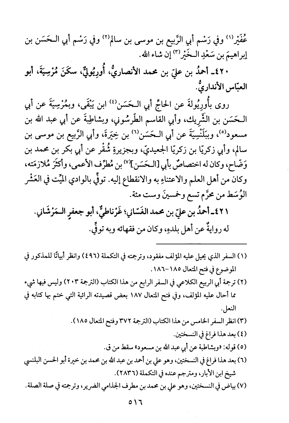 (¬2) ترجمة أبي الربيع الكلاعي في السفر الرابع من هذا الكتاب (الترجمة 203) وليس فيها شيء مما أحال عليه المؤلف، وفي فتح المتعال 187 بعض قصيدته الرائية التي ختم بها كتابه في النعل.