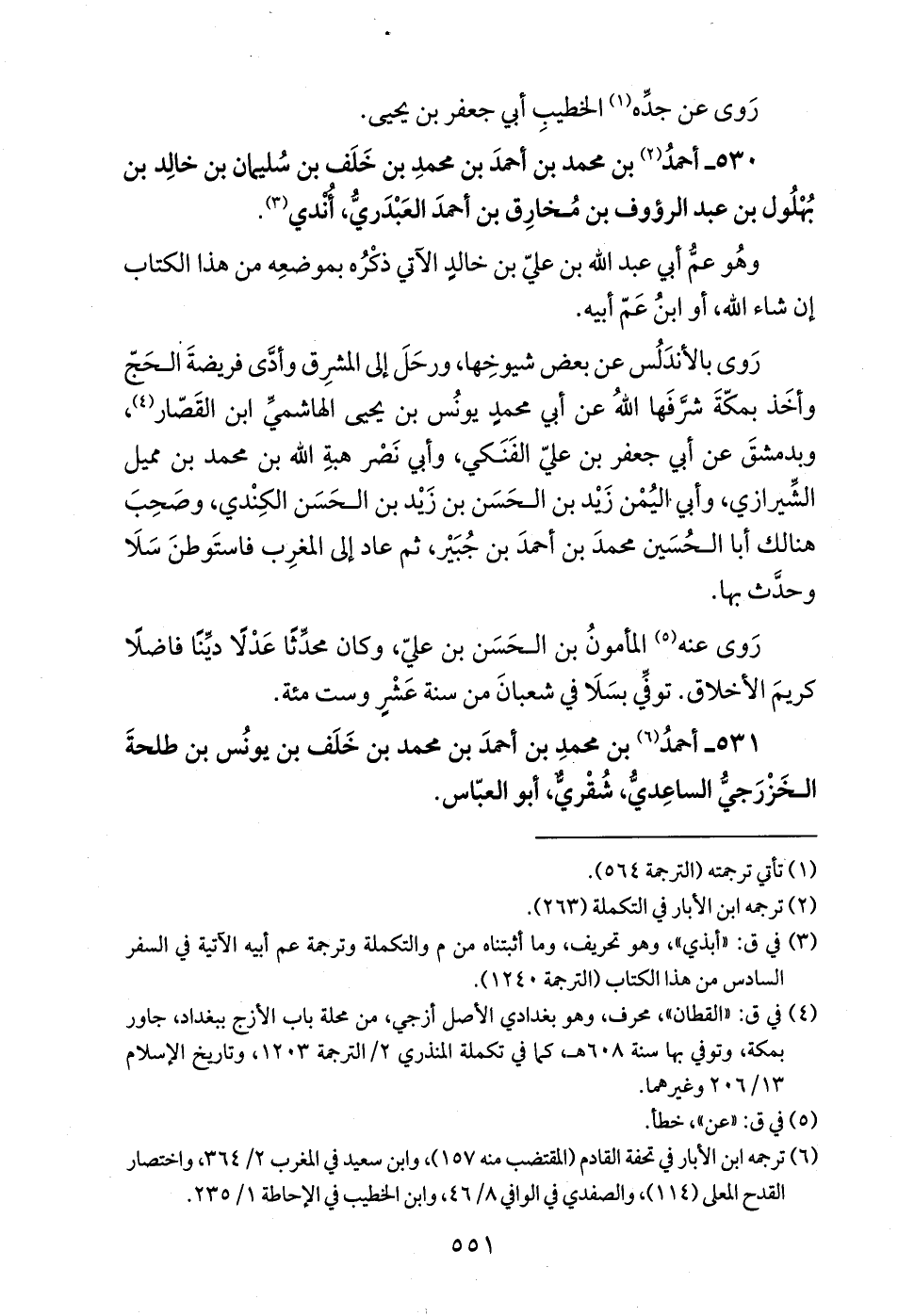 530 - أحمدُ (¬2) بن محمد بن أحمدَ بن محمدِ بن خَلَف بن سُليمان بن خالِد بن بُهْلُول بن عبد الرؤوف بن مُخارِق بن أحمدَ العَبْدَريُّ، أُنْدي (¬3).