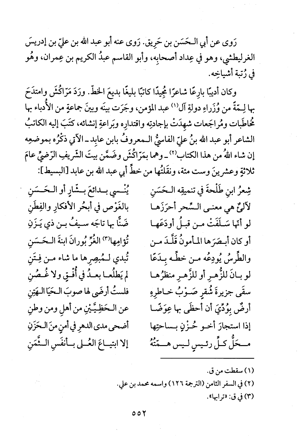 شِعرُ ابنِ طَلْحةَ في تنميقِه الحَسَنِ ... يُنْسي بدائعَ بشّارٍ أوالحَسَنِ