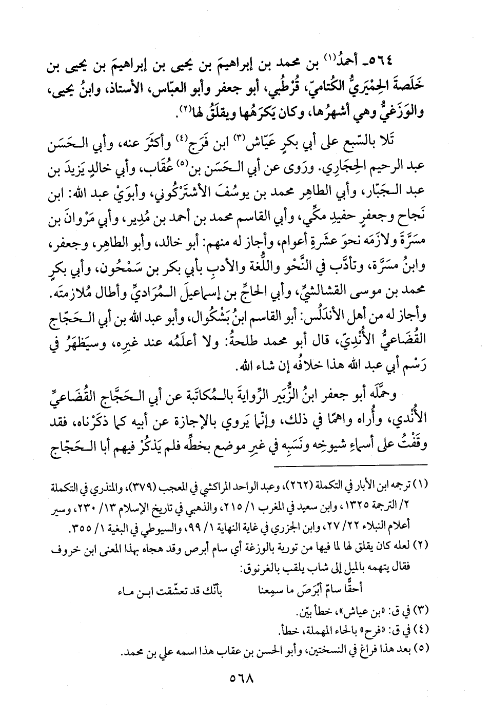 564 - أحمدُ (¬1) بن محمد بن إبراهيمَ بن يحيى بن إبراهيمَ بن يحيى بن خَلَصةَ الحِمْيَريُّ الكُتاميّ، قُرْطُبي، أبو جعفر وأبو العبّاس، الأستاذ، وابنُ يحيى، والوَزَغيُّ وهي أشهرُها، وكان يَكرَهُها ويقلَقُ لها (¬2).
