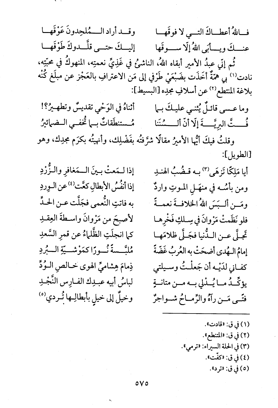 ثُم إنّي عبدُ الأمير أبقاه اللهُ، الناشئُ في غَذِيِّ نعمتِه، المنهوكُ في محبّتِه، نادت (¬1) بي همّةٌ أخَذَت بضَبْعَيْ طَرْفي إلى مَن الاعترافِ بالعَجْز عن مبلَغ كُنْه بلاغة المنتطع (¬2) عن أسلافِ مجدِه [البسيط]: