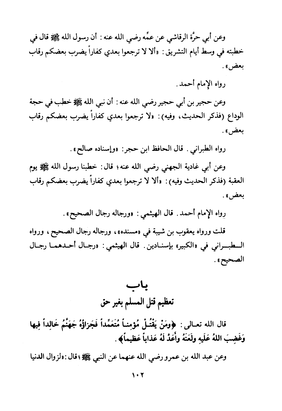 وعن حجير بن أبي حجير رضي الله عنه: أن نبي الله صلى الله عليه وسلم خطب في حجة الوداع (فذكر الحديث، وفيه) : «لا ترجعوا بعدي كفارًا يضرب بعضكم رقاب بعض» .