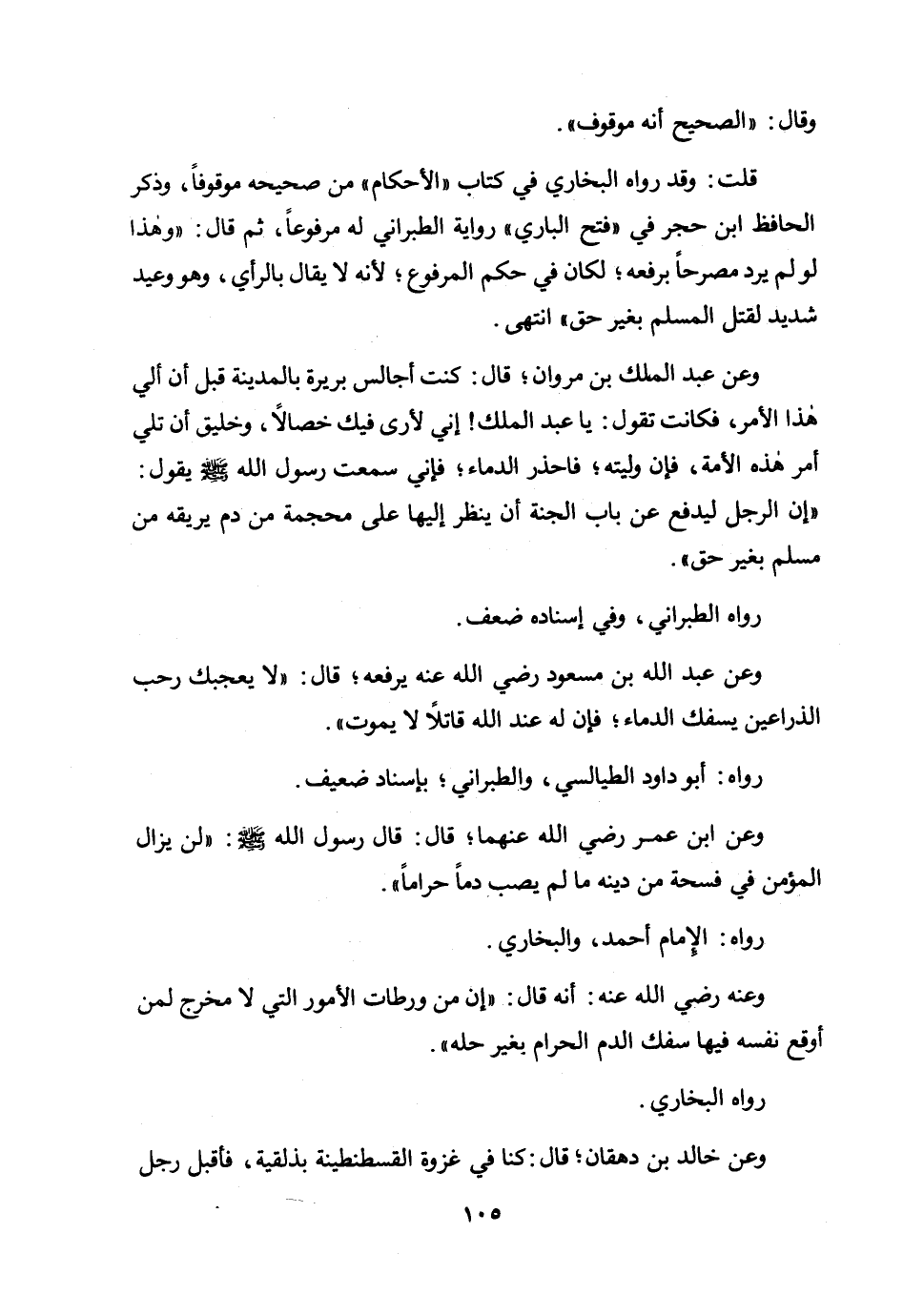 وعن ابن عمر رضي الله عنهما؛ قال: قال رسول الله صلى الله عليه وسلم: «لن يزال المؤمن في فسحة من دينه ما لم يصب دمًا حرامًا» .