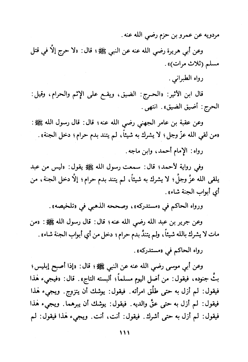 وعن عقبة بن عامر الجهني رضي الله عنه؛ قال: قال رسول الله صلى الله عليه وسلم: «من لقي الله عز وجل لا يشرك به شيئًا، لم يتند بدم حرام؛ دخل الجنة» .