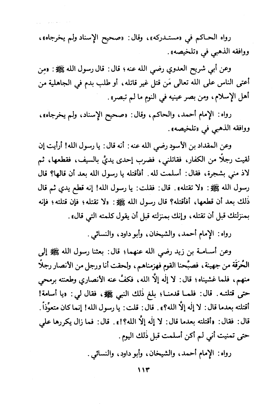 «وعن المقداد بن الأسود رضي الله عنه: أنه قال: يا رسول الله أرأيت إن لقيت رجلًا من الكفار، فقاتلني، فضرب إحدى يدي بالسيف، فقطعها، ثم لاذ مني بشجرة، فقال: أسلمت لله. أفأقتله يا رسول الله بعد أن قالها؟ قال رسول الله صلى الله عليه وسلم: "لا تقتله ". قال: فقلت: يا رسول الله إنه قطع يدي ثم قال ذلك بعد أن قطعها، أفأقتله؟ قال رسول الله صلى الله عليه وسلم: "لا تقتله؛ فإن قتلته فإنه بمنزلتك قبل أن تقتله، وإنك بمنزلته قبل أن يقول كلمته التي قال» .