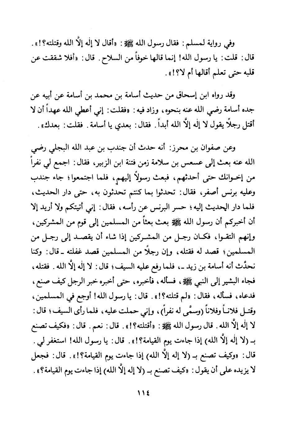 وعن صفوان بن محرز: أنه حدث «أن جندب بن عبد الله البجلي رضي الله عنه بعث إلى عسعس بن سلامة زمن فتنة ابن الزبير، فقال: اجمع لي نفرا من إخوانك حتى أحدثهم، فبعث رسولا إليهم، فلما اجتمعوا جاء جندب وعليه برنس أصفر، فقال: تحدثوا بما كنتم تحدثون به، حتى دار الحديث، فلما دار الحديث إليه حسر البرنس عن رأسه، فقال: إني أتيتكم ولا أريد إلا أن أخبركم أن رسول الله صلى الله عليه وسلم بعث بعثًا من المسلمين إلى قوم من المشركين، وإنهم التقوا، فكان رجل من المشركين إذا شاء أن يقصد إلى رجل من المسلمين قصد له فقتله، وإن رجلًا من المسلمين قصد غفلته - قال: وكنا نحدث أنه أسامة بن زيد - فلما رفع عليه السيف قال: لا إله إلا الله. فقتله، فجاء البشير إلى النبي صلى الله عليه وسلم فسأله، فأخبره حتى أخبره خبر الرجل كيف صنع، فدعاه فسأله، فقال: "لم قتلته؟ ". قال: يا رسول الله أوجع في المسلمين، وقتل فلانًا وفلانًا (وسمى له نفرًا) ، وإني حملت عليه، فلما رأى السيف قال: لا إله إلا الله. قال رسول الله صلى الله عليه وسلم: "أقتلته؟ ". قال: نعم. قال: "فكيف تصنع بـ (لا إله إلا الله) إذا جاءت يوم القيامة؟ ". قال: يا رسول الله استغفر لي. قال: "وكيف تصنع بـ (لا إله إلا الله) إذا جاءت يوم القيامة؟» .