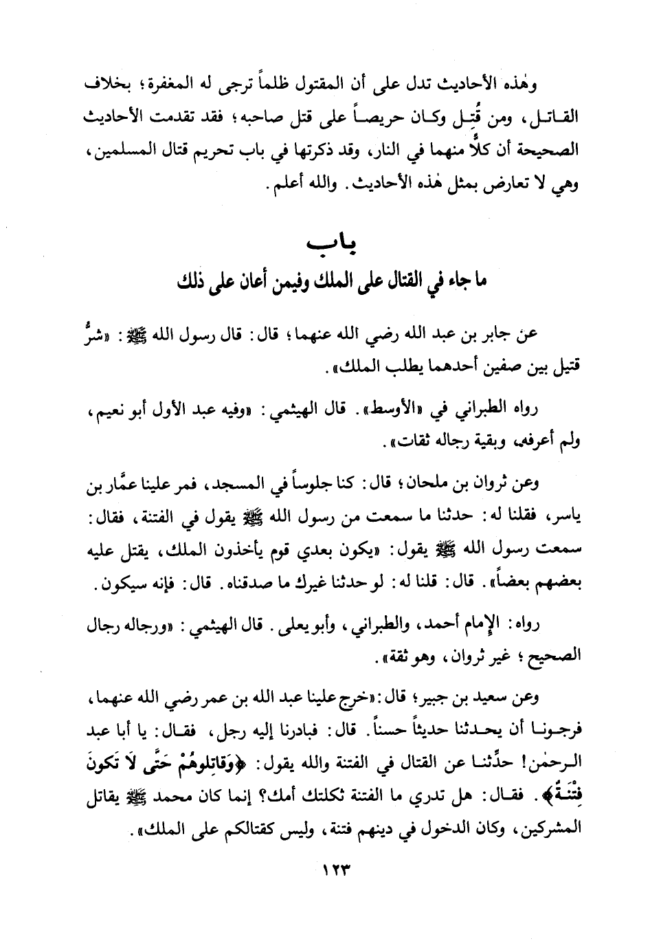 وعن سعيد بن جبير؛ قال: "خرج علينا عبد الله بن عمر رضي الله عنهما، فرجونا أن يحدثنا حديثا حسنا. قال: فبادرنا إليه رجل، فقال: يا أبا عبد الرحمن! حدثنا عن القتال في الفتنة والله يقول: {وَقَاتِلُوهُمْ حَتَّى لَا تَكُونَ فِتْنَةٌ} . فقال: هل تدري ما الفتنة ثكلتك أمك؟ إنما كان محمد صلى الله عليه وسلم يقاتل المشركين، وكان الدخول في دينهم فتنة، وليس كقتالكم على الملك".