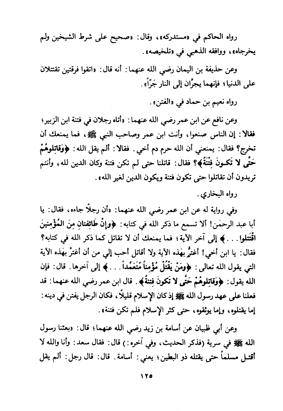 وعن نافع عن ابن عمر رضي الله عنهما: "أتاه رجلان في فتنة ابن الزبير؛ فقالا: إن الناس صنعوا، وأنت ابن عمر وصاحب النبي صلى الله عليه وسلم، فما يمنعك أن تخرج؟ فقال: يمنعني أن الله حرم دم أخي. فقالا: ألم يقل الله: {وَقَاتِلُوهُمْ حَتَّى لَا تَكُونَ فِتْنَةٌ} ؟ فقال: قاتلنا حتى لم تكن فتنة وكان الدين لله، وأنتم تريدون أن تقاتلوا حتى تكون فتنة ويكون الدين لغير الله".