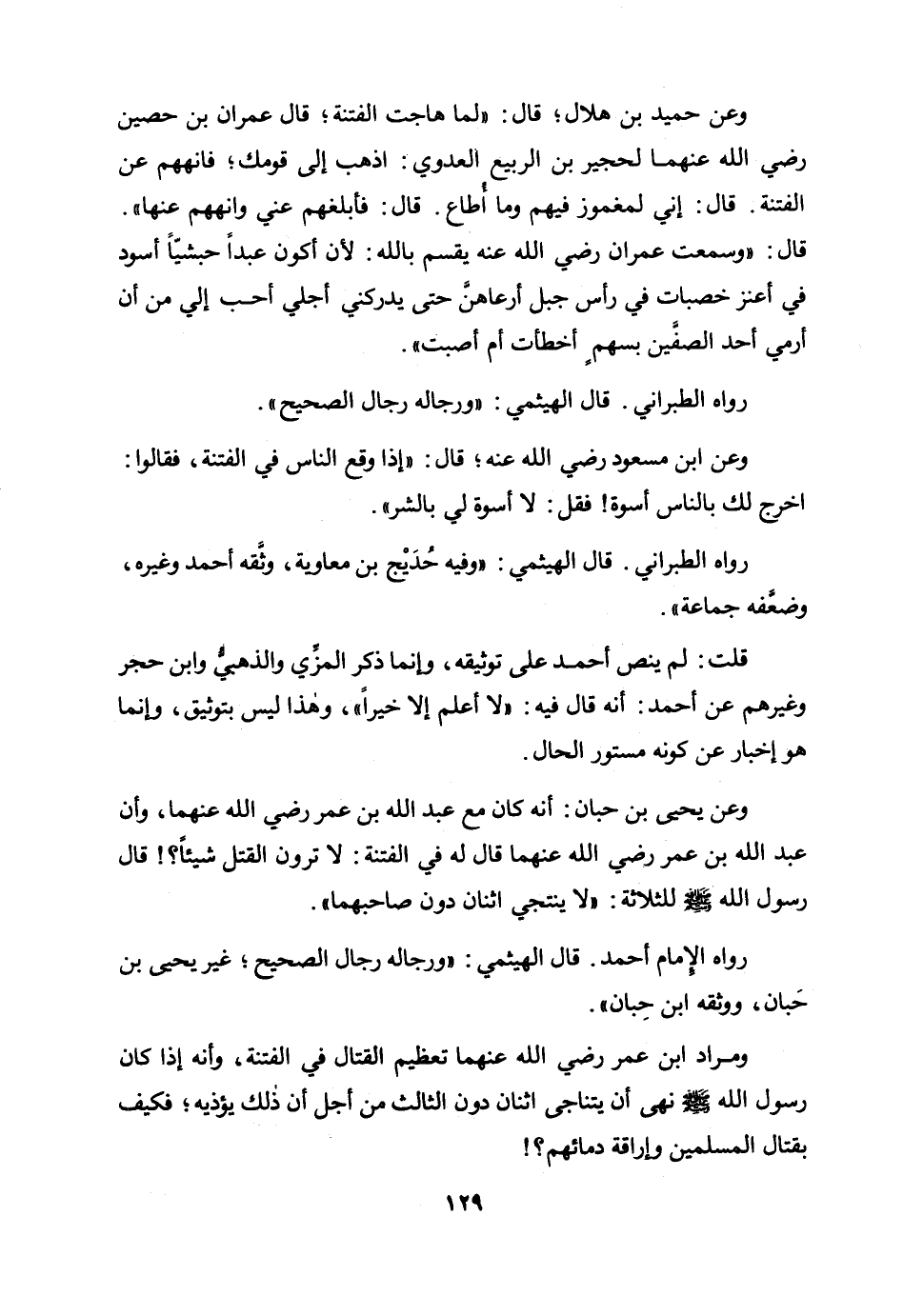 وعن حميد بن هلال؛ قال: "لما هاجت الفتنة؛ قال عمران بن حصين رضي الله عنهما لحجير بن الربيع العدوي: اذهب إلى قومك فانههم عن الفتنة. قال: إني لمغموز فيهم وما أطاع. قال: فأبلغهم عني وانههم عنها".