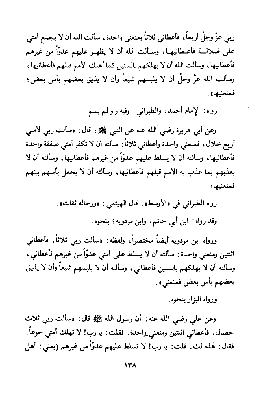 «ربي عز وجل أربعًا، فأعطاني ثلاثًا ومنعني واحدة، سألت الله أن لا يجمع أمتي على ضلالة فأعطانيها، وسألت الله أن لا يظهر عليهم عدوًا من غيرهم فأعطانيها، وسألت الله أن لا يهلكهم بالسنين كما أهلك الأمم قبلهم فأعطانيها، وسألت الله عز وجل أن لا يلبسهم شيعًا وأن لا يذيق بعضهم بأس بعض؛ فمنعنيها» .