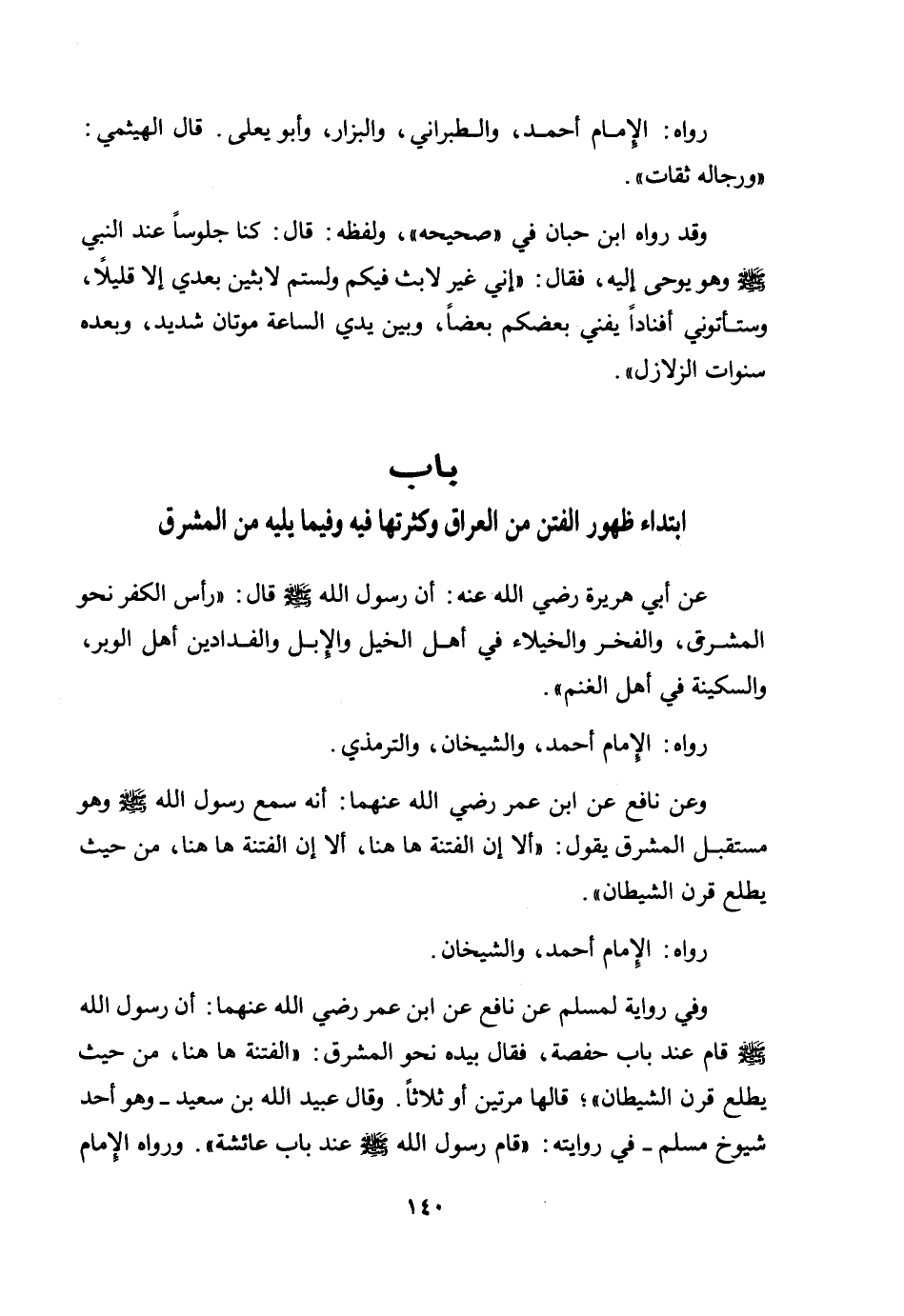 وعن نافع عن ابن عمر رضي الله عنهما: أنه سمع رسول الله صلى الله عليه وسلم وهو مستقبل المشرق يقول: «ألا إن الفتنة هاهنا، ألا إن الفتنة هاهنا، من حيث يطلع قرن الشيطان» .