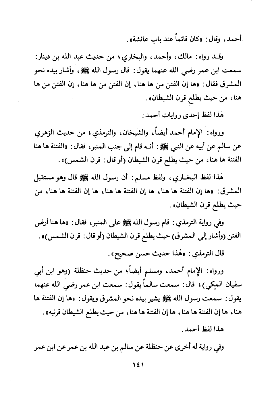 ورواه: الإمام أحمد أيضا، والشيخان، والترمذي؛ من حديث الزهري عن سالم عن أبيه عن النبي صلى الله عليه وسلم: أنه قام إلى جنب المنبر، فقال: «الفتنة هاهنا الفتنة هاهنا، من حيث يطلع قرن الشيطان (أو قال: قرن الشمس) » .