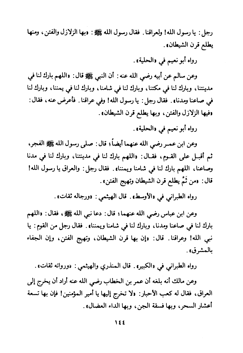 «رجل: يا رسول الله! ولعراقنا. فقال رسول الله صلى الله عليه وسلم: "بها الزلازل والفتن، ومنها يطلع قرن الشيطان» .