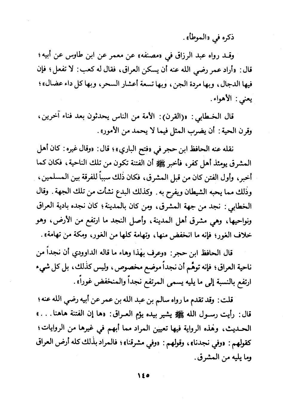 نقله عنه الحافظ ابن حجر في "فتح الباري"؛ قال: "وقال غيره: كان أهل المشرق يومئذ أهل كفر، فأخبر صلى الله عليه وسلم أن الفتنة تكون من تلك الناحية، فكان كما أخبر، وأول الفتن كان من قبل المشرق، فكان ذلك سببا للفرقة بين المسلمين، وذلك مما يحبه الشيطان ويفرح به. وكذلك البدع نشأت من تلك الجهة. وقال الخطابي: نجد من جهة المشرق، ومن كان بالمدينة؛ كان نجده بادية العراق ونواحيها، وهي مشرق أهل المدينة، وأصل نجد ما ارتفع من الأرض، وهو خلاف الغور؛ فإنه ما انخفض منها، وتهامة كلها من الغور، ومكة من تهامة".