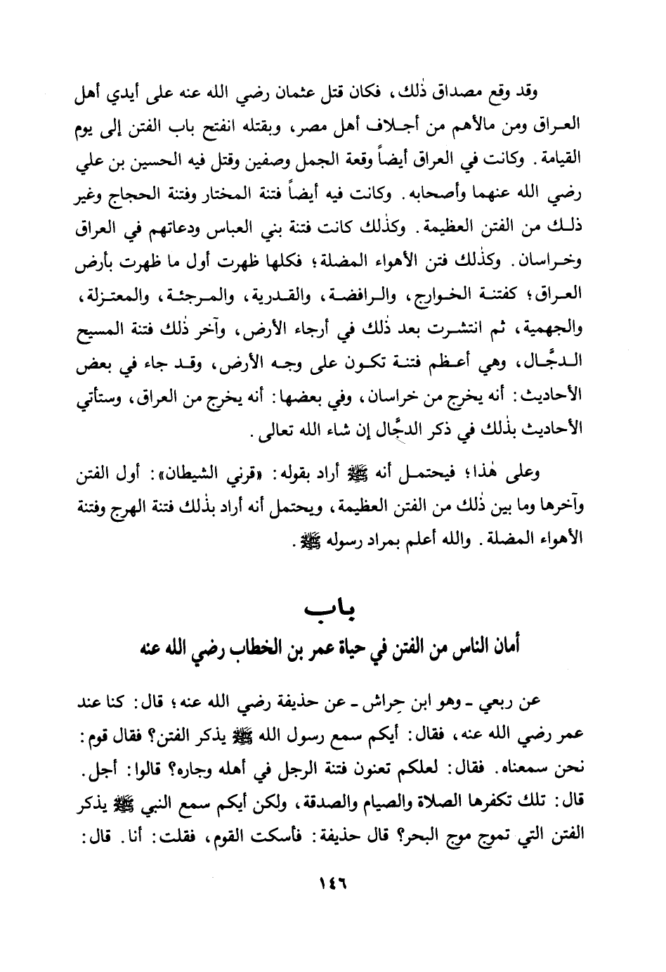 عن ربعي - وهو ابن حِراش - عن حذيفة رضي الله عنه؛ قال: كنا عند عمر رضي الله عنه، فقال: أيكم سمع رسول الله صلى الله عليه وسلم يذكر الفتن؟ فقال قوم: نحن سمعناه. فقال: لعلكم تعنون فتنة الرجل في أهله وجاره؟ قالوا: أجل. قال: تلك تكفرها الصلاة والصيام والصدقة، ولكن أيكم سمع النبي صلى الله عليه وسلم يذكر الفتن التي تموج موج البحر؟ قال حذيفة: فأسكت القوم، فقلت: أنا. قال: