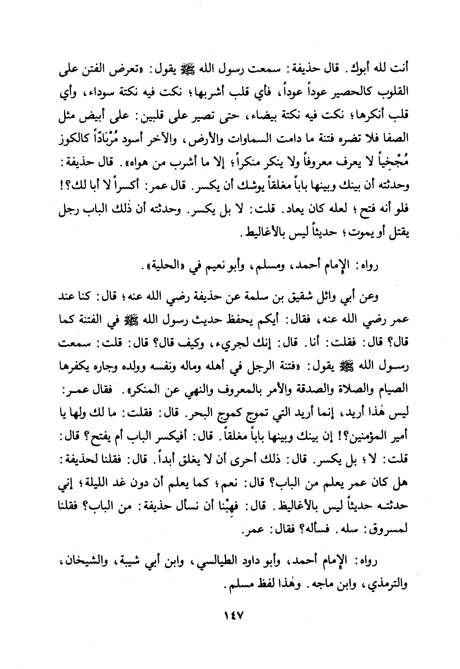 أنت لله أبوك. قال حذيفة: سمعت رسول الله صلى الله عليه وسلم يقول: «تعرض الفتن على القلوب كالحصير عودًا عودًا، فأي قلب أشربها؛ نكت فيه نكتة سوداء، وأي قلب أنكرها؛ نكت فيه نكتة بيضاء، حتى تصير على قلبين: على أبيض مثل الصفا فلا تضره فتنة ما دامت السماوات والأرض، والآخر أسود مُرْبَادًا كالكوز مُجْخِيًا لا يعرف معروفًا ولا ينكر منكرًا؛ إلا ما أشرب من هواه» . قال حذيفة: وحدثته أن بينك وبينها بابا مغلقا يوشك أن يكسر. قال عمر: أكسرا لا أبا لك؟ ! فلو أنه فتح لعله كان يعاد. قلت: لا بل يكسر. وحدثته أن ذلك الباب رجل يقتل أو يموت؛ حديثا ليس بالأغاليط.