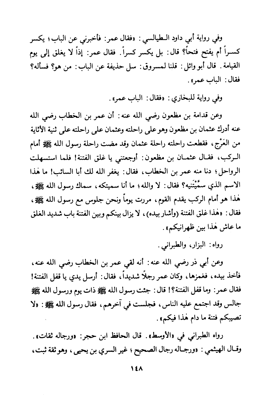 وفي رواية أبي داود الطيالسي: "فقال عمر: فأخبرني عن الباب؛ يكسر كسرا أم يفتح فتحا؟ قال: بل يكسر كسرا. فقال عمر: إذا لا يغلق إلى يوم القيامة. قال أبو وائل: قلنا لمسروق: سل حذيفة عن الباب: من هو؟ فسأله؟ فقال: الباب عمر ".