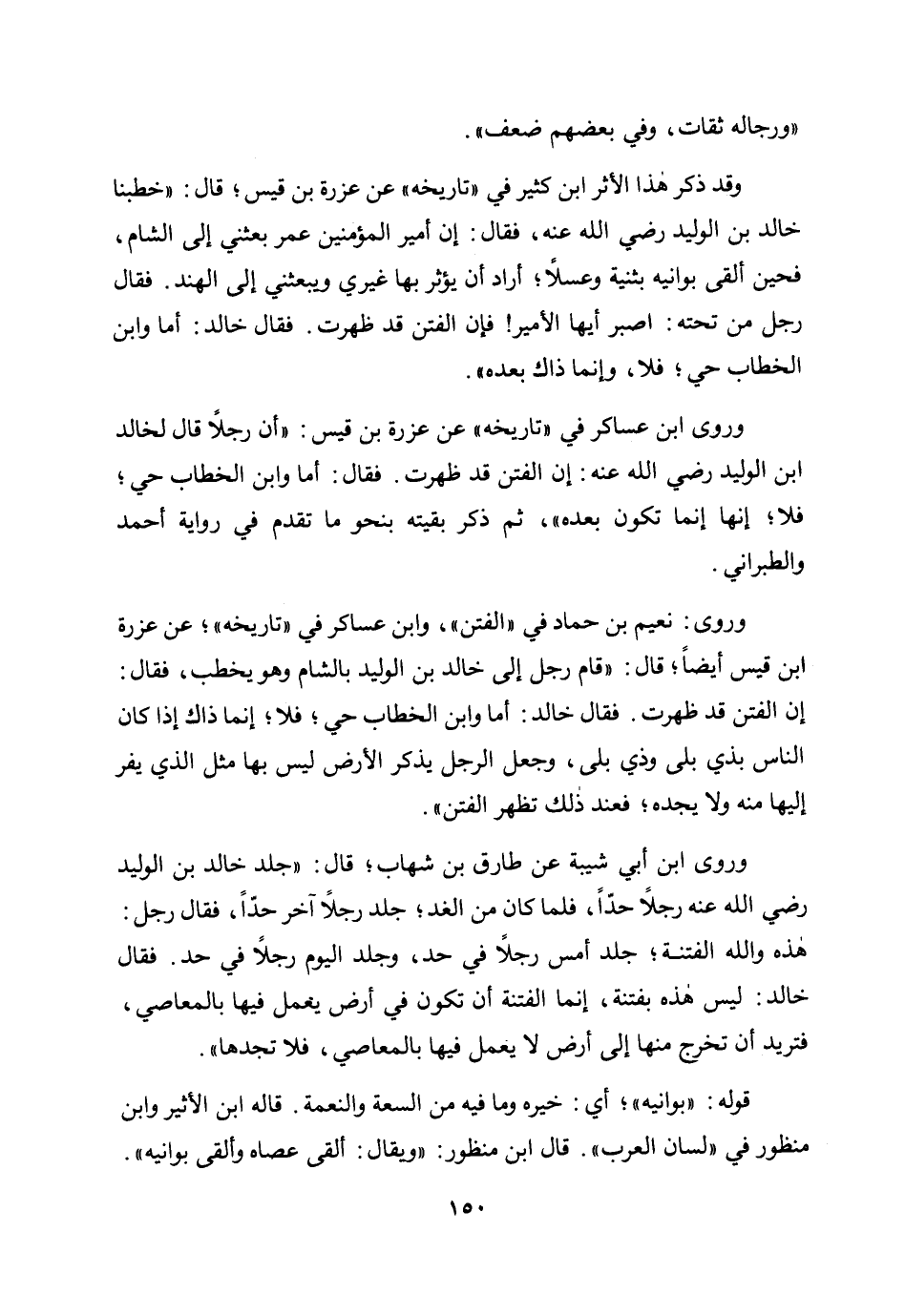 وروى: نعيم بن حماد في "الفتن"، وابن عساكر في "تاريخه"؛ عن عزرة بن قيس أيضا؛ قال: "قام رجل إلى خالد بن الوليد بالشام وهو يخطب، فقال: إن الفتن قد ظهرت. فقال خالد: أما وابن الخطاب حي فلا؛ إنما ذاك إذا كان الناس بذي بلى وذي بلى، وجعل الرجل يذكر الأرض ليس بها مثل الذي يفر إليها منه ولا يجده؛ فعند ذلك تظهر الفتن".