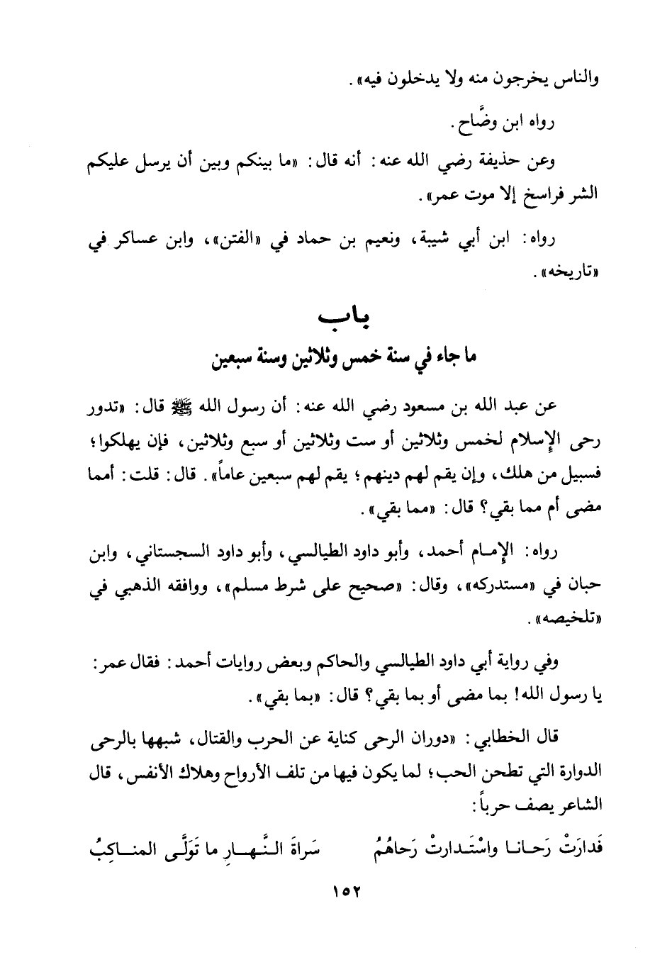 عن عبد الله بن مسعود رضي الله عنه: أن رسول الله صلى الله عليه وسلم قال: «تدور رحى الإسلام لخمس وثلاثين أو ست وثلاثين أو سبع وثلاثين، فإن يهلكوا فسبيل من هلك، وإن يقم لهم دينهم يقم لهم سبعين عامًا. قال: قلت: أمما مضى أم مما بقي؟ قال: "مما بقي"» .