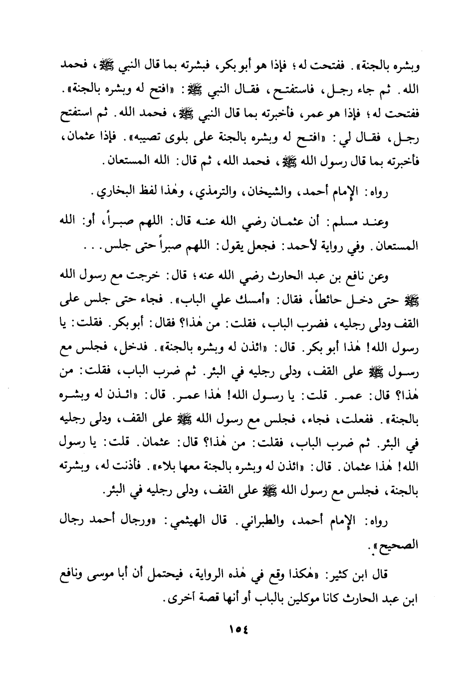 وعن نافع بن عبد الحارث رضي الله عنه؛ قال: «خرجت مع رسول الله صلى الله عليه وسلم حتى دخل حائطًا، فقال: "أمسك علي الباب". فجاء حتى جلس على القف ودلى رجليه، فضرب الباب، فقلت: من هذا؟ فقال: أبو بكر. فقلت: يا رسول الله! هذا أبو بكر. قال: "ائذن له وبشره بالجنة ". فدخل، فجلس مع رسول الله صلى الله عليه وسلم على القف، ودلى رجليه في البئر. ثم ضرب الباب، فقلت: من هذا؟. قال: عمر. قلت: يا رسول الله! هذا عمر. قال: "ائذن له وبشره بالجنة". ففعلت، فجاء، فجلس مع رسول الله صلى الله عليه وسلم على القف، ودلى رجليه في البئر. ثم ضرب الباب، فقلت: من هذا؟ قال: عثمان. قلت: يا رسول الله! هذا عثمان. قال: "ائذن له وبشره بالجنة معها بلاء". فأذنت له وبشرته بالجنة، فجلس مع رسول الله صلى الله عليه وسلم على القف، ودلى رجليه في البئر» .