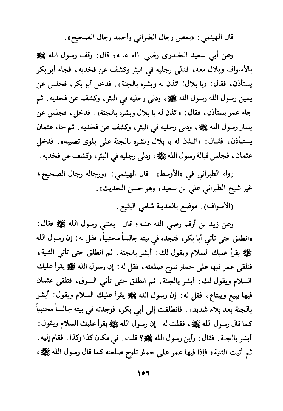 وعن أبي سعيد الخدري رضي الله عنه؛ قال: «وقف رسول الله صلى الله عليه وسلم بالأسواف وبلال معه، فدلى رجليه في البئر وكشف عن فخذيه، فجاء أبو بكر يستأذن، فقال: "يا بلال! ائذن له وبشره بالجنة ". فدخل أبو بكر فجلس عن يمين رسول الله صلى الله عليه وسلم، ودلى رجليه في البئر، وكشف عن فخديه. ثم جاء عمر يستأذن، فقال: "ائذن له يا بلال وبشره بالجنة ". فدخل فجلس عن يسار رسول الله صلى الله عليه وسلم، ودلى رجليه في البئر، وكشف عن فخديه. ثم جاء عثمان يستأذن، فقال: "ائذن له يا بلال وبشره بالجنة على بلوى تصيبه". فدخل عثمان، فجلس قبالة رسول الله صلى الله عليه وسلم، ودلى رجليه في البئر، وكشف عن فخديه» .