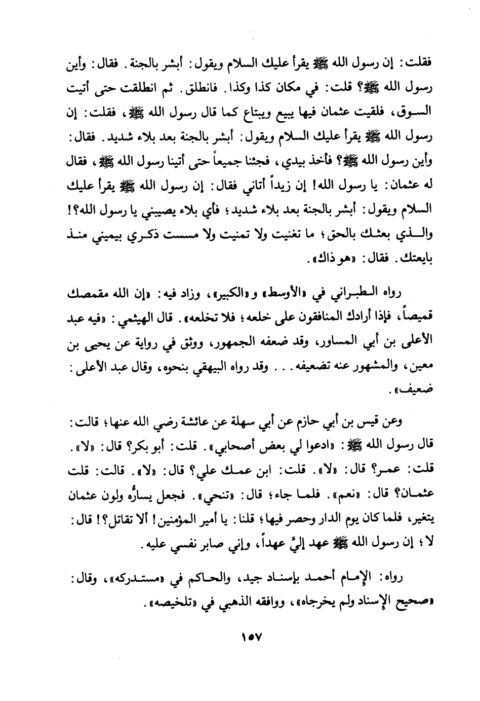 «فقلت: إن رسول الله صلى الله عليه وسلم يقرأ عليك السلام ويقول: أبشر بالجنة. فقال: وأين رسول الله صلى الله عليه وسلم؟ قلت: في مكان كذا وكذا. فانطلق. ثم انطلقت حتى أتيت السوق، فلقيت عثمان فيها يبيع ويبتاع كما قال رسول الله صلى الله عليه وسلم، فقلت: إن رسول الله صلى الله عليه وسلم يقرأ عليك السلام ويقول: أبشر بالجنة بعد بلاء شديد. فقال: وأين رسول الله صلى الله عليه وسلم؟ فأخذ بيدي، فجئنا جميعًا حتى أتينا رسول الله صلى الله عليه وسلم، فقال له عثمان: يا رسول الله! إن زيدًا أتاني فقال: إن رسول الله صلى الله عليه وسلم يقرأ عليك السلام ويقول: أبشر بالجنة بعد بلاء شديد؛ فأي بلاء يصيبني يا رسول الله؟ ! والذي بعثك بالحق ما تغنيت ولا تمنيت ولا مسست ذكري بيميني منذ بايعتك. فقال: "هو ذاك» .