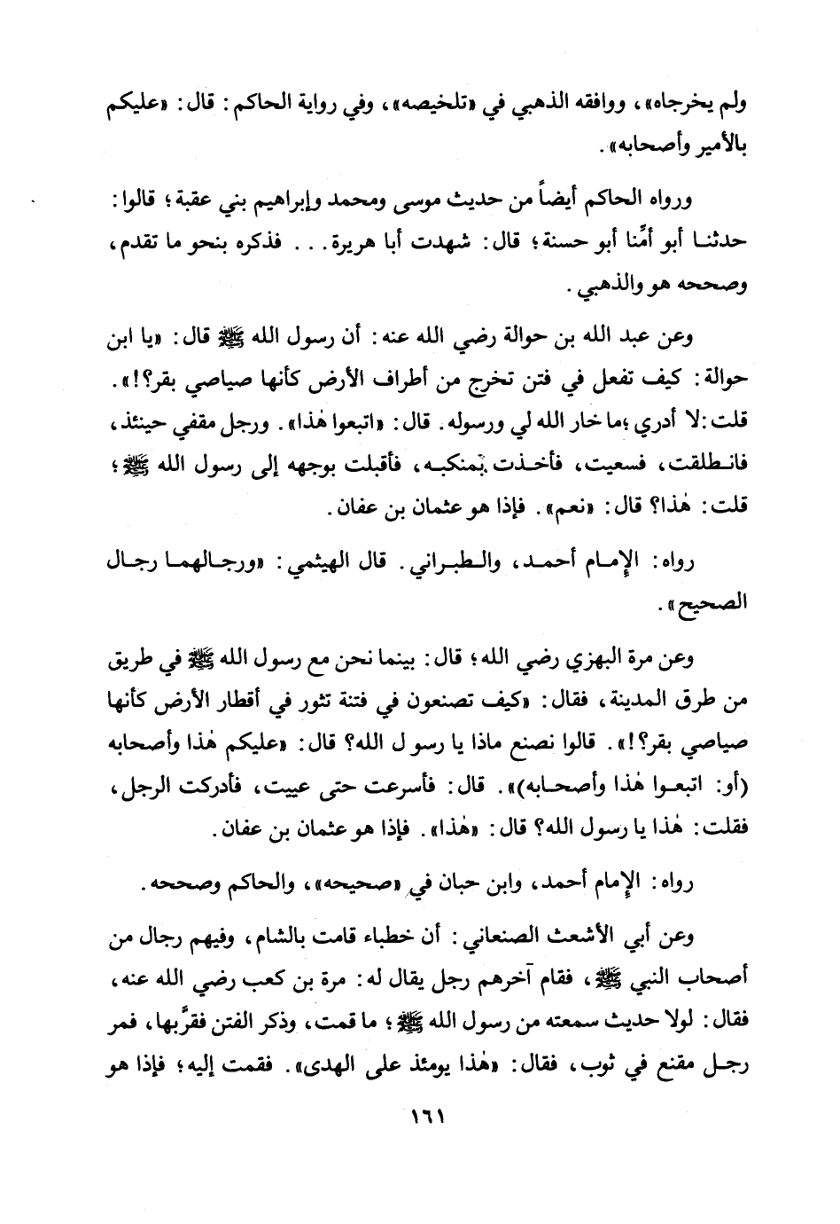 وعن مرة البهزي رضي الله عنه؛ قال: بينما نحن مع رسول الله صلى الله عليه وسلم في طريق من طرق المدينة، فقال: «"كيف تصنعون في فتنة تثور في أقطار الأرض كأنها صياصي بقر؟ ! " قالوا: نصنع ماذا يا رسول الله؟ قال: "عليكم هذا وأصحابه (أو: اتبعوا هذا وأصحابه) " قال: فأسرعت حتى عييت، فأدركت الرجل، فقلت: هذا يا رسول الله؟ قال: "هذا ". فإذا هو عثمان بن عفان» .