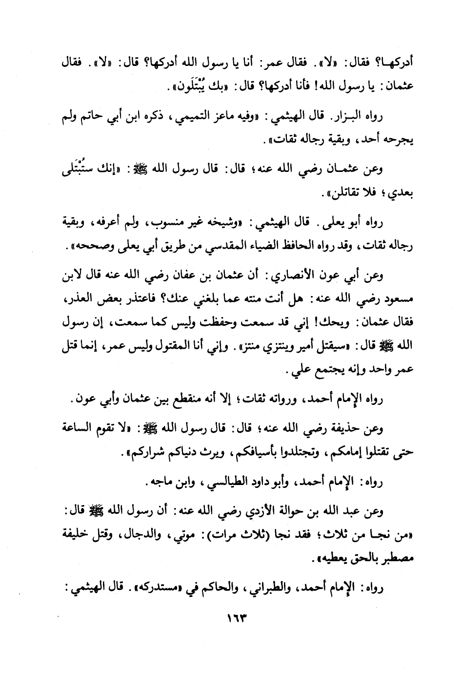 «أدركها؟ فقال: "لا". فقال عمر: أنا يا رسول الله أدركها؟ قال: "لا". فقال عثمان: يا رسول الله! فأنا أدركها؟ قال: "بك يبتلون» .