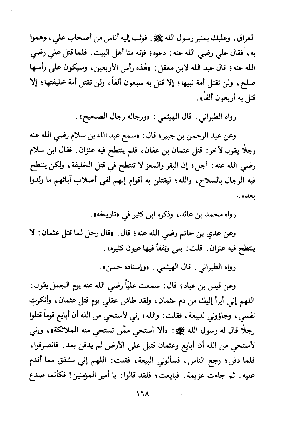 وعن عدي بن حاتم رضي الله عنه؛ قال: "قال رجل لما قتل عثمان: لا ينتطح فيه عنزان. قلت: بلى وتفقأ فيها عيون كثيرة".