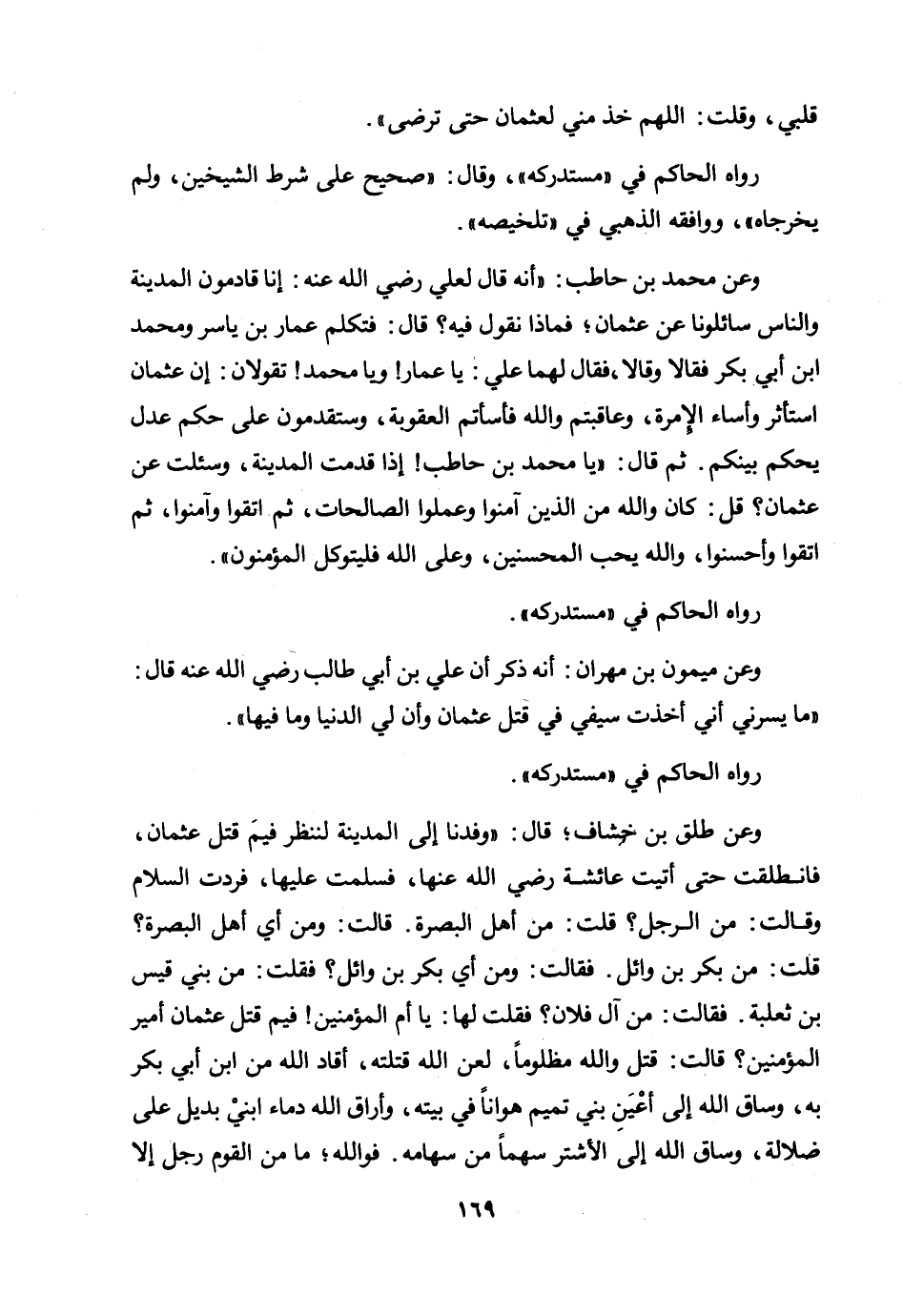 وعن طلق بن خشاف؛ قال: "وفدنا إلى المدينة لننظر فيم قتل عثمان، فانطلقت حتى أتيت عائشة رضي الله عنها، فسلمت عليها، فردت السلام وقالت: من الرجل؟ قلت: من أهل البصرة. قالت: ومن أي أهل البصرة؟ قلت: من بكر بن وائل. فقالت: ومن أي بكر بن وائل؟ فقلت: من بني قيس بن ثعلبة. فقالت: من آل فلان؟ فقلت لها: يا أم المؤمنين! فيم قتل عثمان أمير المؤمنين؟ قالت: قتل والله مظلوما، لعن الله قتلته، أقاد الله من ابن أبي بكر به، وساق الله إلى أعين بني تميم هوانا في بيته، وأراق الله دماء ابني بديل على ضلالة، وساق الله إلى الأشتر سهما من سهامه. فوالله؛ ما من القوم رجل إلا