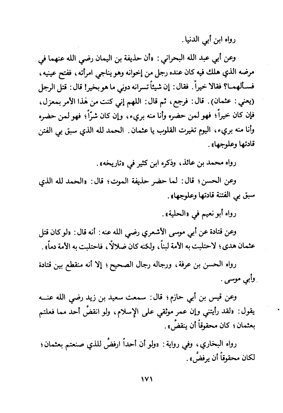 وعن أبي عبد الله البحراني: "أن حذيفة بن اليمان رضي الله عنهما في مرضه الذي هلك فيه كان عنده رجل من إخوانه وهو يناجي امرأته، ففتح عينيه، فسألهما؟ فقالا خيرا. فقال: إن شيئا تسرانه دوني ما هو بخير! قال: قتل الرجل (يعني: عثمان) . قال: فرجع، ثم قال: اللهم إني كنت من هذا الأمر بمعزل، فإن كان خيرا فهو لمن حضره وأنا منه بريء، وإن كان شرا فهو لمن حضره وأنا منه بريء، اليوم تغيرت القلوب يا عثمان. الحمد لله الذي سبق بي الفتن قادتها وعلوجها".