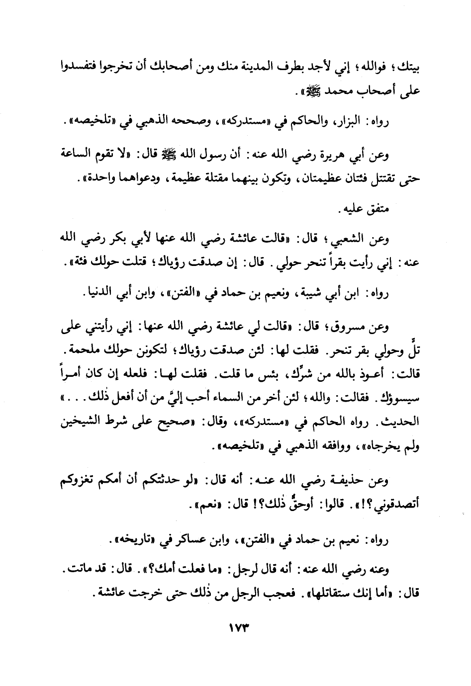 وعن الشعبي؛ قال: "قالت عائشة رضي الله عنها لأبي بكر رضي الله عنه: إني رأيت بقرا تنحر حولي. قال: إن صدقت رؤياك قتلت حولك فئة".