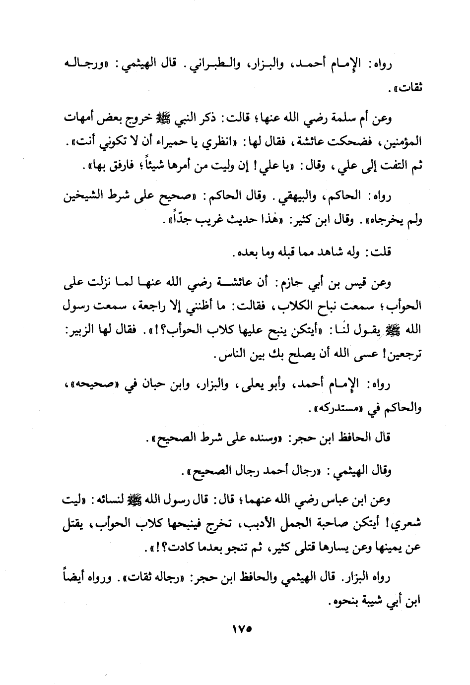 وعن قيس بن أبي حازم: «أن عائشة رضي الله عنها لما نزلت على الحوأب؛ سمعت نباح الكلاب، فقالت: ما أظنني إلا راجعة، سمعت رسول الله صلى الله عليه وسلم يقول لنا: "أيتكن ينبح عليها كلاب الحوأب؟ ! ". فقال لها الزبير: ترجعين؟ عسى الله أن يصلح بك بين الناس» .
