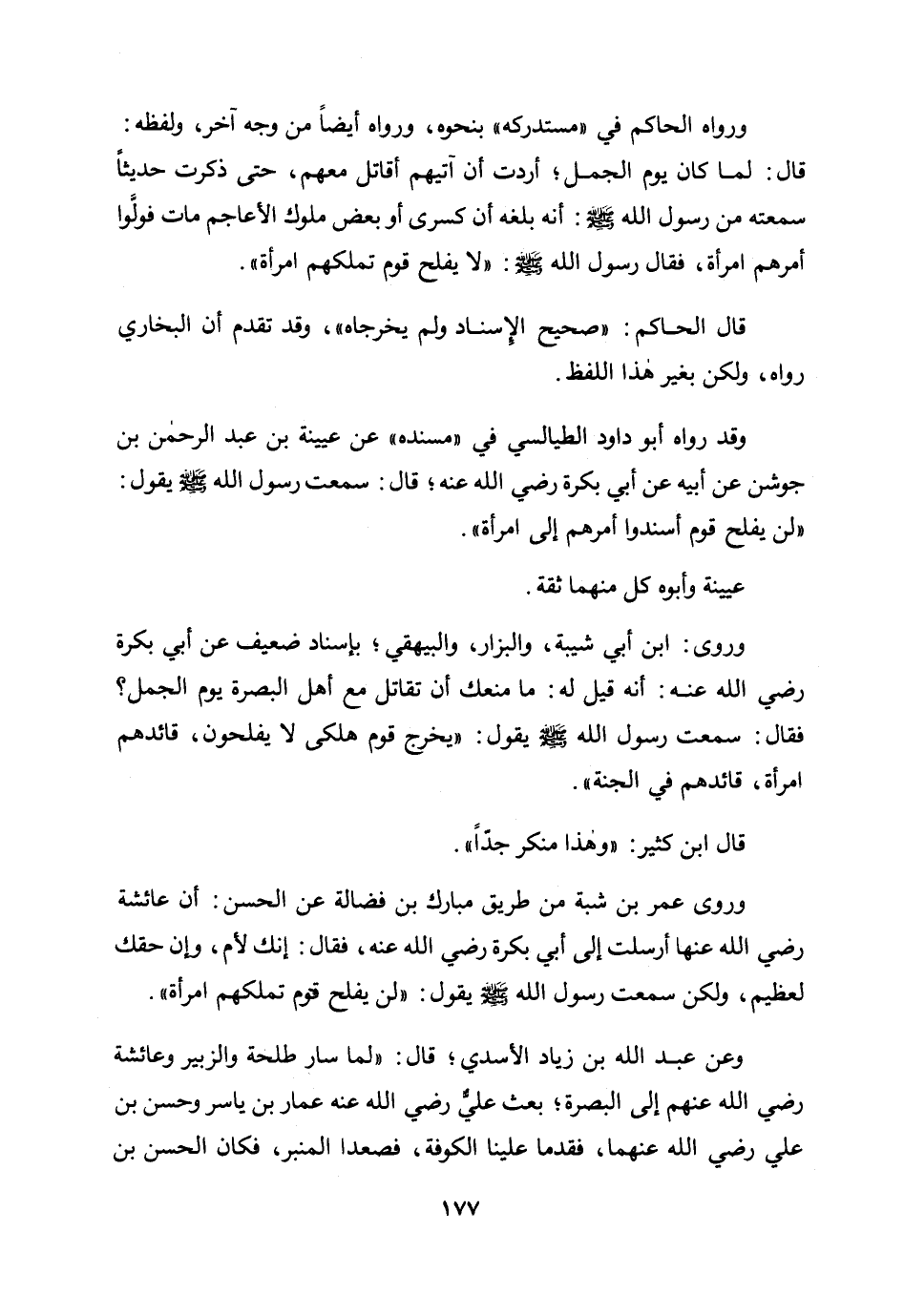 وروى عمر بن شبة من طريق مبارك بن فضالة عن الحسن: أن عائشة رضي الله عنها أرسلت إلى أبي بكرة رضي الله عنه، فقال: إنك لأم، وإن حقك لعظيم، ولكن سمعت رسول الله صلى الله عليه وسلم يقول: «لن يفلح قوم ولوا أمرهم امرأة» .