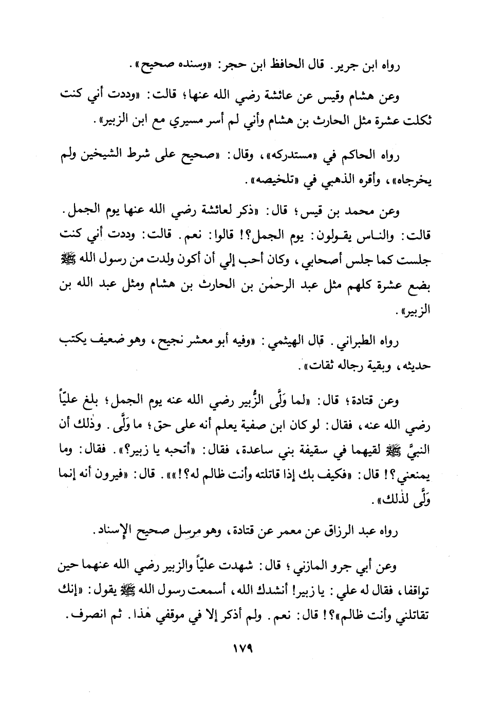 وعن قتادة؛ قال: «"لما ولى الزبير رضي الله عنه يوم الجمل؛ بلغ عليًا رضي الله عنه، فقال: لو كان ابن صفية يعلم أنه على حق ما ولى. وذلك أن النبي صلى الله عليه وسلم لقيهما في سقيفة بني ساعدة، فقال: "أتحبه يا زبير؟ ". فقال: وما يمنعني؟ ! قال: "فكيف بك إذا قاتلته وأنت ظالم له؟ ! "» . قال: "فيرون أنه إنما ولى لذلك".