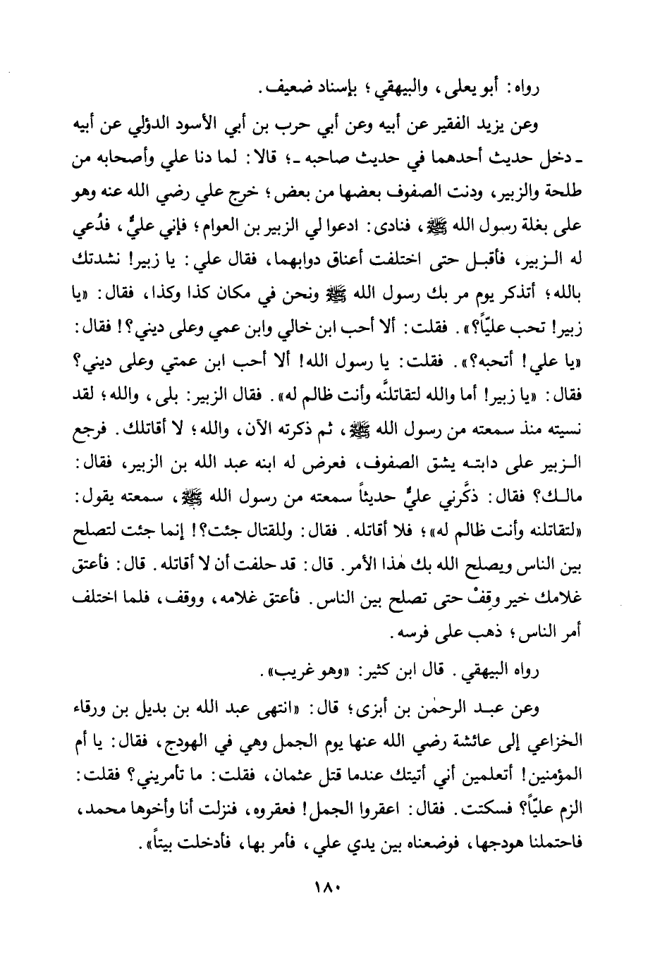 وعن يزيد الفقير عن أبيه وعن أبي حرب بن أبي الأسود الدؤلي عن أبيه - دخل حديث أحدهما في حديث صاحبه - قالا: «لما دنا علي وأصحابه من طلحة والزبير، ودنت الصفوف بعضها من بعض؛ خرج علي رضي الله عنه وهو على بغلة رسول الله صلى الله عليه وسلم، فنادى: ادعوا لي الزبير بن العوام؛ فإني علي، فدعي له الزبير، فأقبل حتى اختلفت أعناق دوابهما، فقال علي: يا زبير! نشدتك بالله أتذكر يوم مر بك رسول الله صلى الله عليه وسلم ونحن في مكان كذا وكذا، فقال: "يا زبير! تحب عليًا؟ ". فقلت: ألا أحب ابن خالي وابن عمي وعلى ديني؟ ! فقال: "يا علي! أتحبه؟ ". فقلت: يا رسول الله! ألا أحب ابن عمتي وعلى ديني؟ فقال: "يا زبير! أما والله لتقاتلنه وأنت ظالم له". فقال الزبير: بلى، والله؛ لقد نسيته منذ سمعته من رسول الله صلى الله عليه وسلم، ثم ذكرته الآن، والله لا أقاتلك.» فرجع الزبير على دابته يشق الصفوف، فعرض له ابنه عبد الله بن الزبير، فقال: ما لك؟ فقال: ذكرني علي حديثا سمعته من رسول الله صلى الله عليه وسلم، سمعته يقول: «لتقاتلنه وأنت ظالم له» ؛ فلا أقاتله. فقال: وللقتال جئت؟ ! إنما جئت لتصلح بين الناس ويصلح الله بك هذا الأمر. قال: قد حلفت أن لا أقاتله. قال: فأعتق غلامك خير وقف حتى تصلح بين الناس. فأعتق غلامه، ووقف، فلما اختلف أمر الناس ذهب على فرسه.