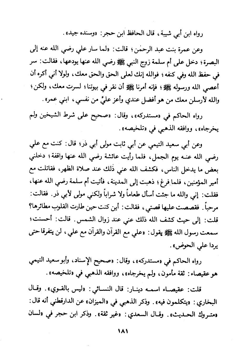 وعن أبي سعيد التيمي عن أبي ثابت مولى أبي ذر؛ قال: كنت مع علي رضي الله عنه يوم الجمل، فلما رأيت عائشة رضي الله عنها واقفة؛ دخلني بعض ما يدخل الناس، فكشف الله عني ذلك عند صلاة الظهر، فقاتلت مع أمير المؤمنين، فلما فرغ ذهبت إلى المدينة، فأتيت أم سلمة رضي الله عنها، فقلت: إني والله ما جئت أسأل طعاما ولا شرابا ولكني مولى لأبي ذر. فقالت: مرحبا. فقصصت عليها قصتي، فقالت: أين كنت حين طارت القلوب مطائرها؟ قلت: إلى حيث كشف الله ذلك عني عند زوال الشمس. قالت: أحسنت؛ سمعت رسول الله صلى الله عليه وسلم يقول: «علي مع القرآن والقرآن مع علي، لن يتفرقا حتى يردا علي الحوض» .