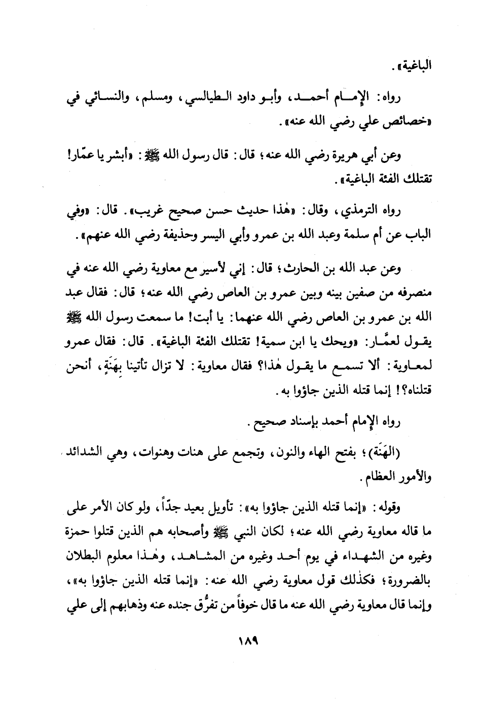 وعن عبد الله بن الحارث؛ قال: إني لأسير مع معاوية رضي الله عنه في منصرفه من صفين بينه وبين عمرو بن العاص رضي الله عنه؛ قال: فقال عبد الله بن عمرو بن العاص رضي الله عنهما: يا أبت! ما سمعت رسول الله صلى الله عليه وسلم يقول لعمار: «ويحك يابن سمية! تقتلك الفئة الباغية» . قال: فقال عمرو لمعاوية: ألا تسمع ما يقول هذا؟ فقال معاوية: لا تزال تأتينا بهنة، أنحن قتلناه؟ ! إنما قتله الذين جاؤوا به.