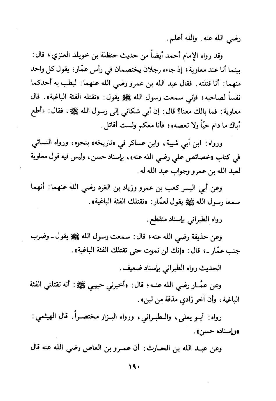 وقد رواه الإمام أحمد أيضا من حديث حنظلة بن خويلد العنزي؛ قال: بينما أنا عند معاوية إذ جاءه رجلان يختصمان في رأس عمار؛ يقول كل واحد منهما: أنا قتلته. فقال عبد الله بن عمرو رضي الله عنهما: ليطب به أحدكما نفسا لصاحبه؛ فإني سمعت رسول الله صلى الله عليه وسلم يقول: «تقتله الفئة الباغية» . قال معاوية: فما بالك معنا؟ قال: إن أبي شكاني إلى رسول الله صلى الله عليه وسلم، فقال: «أطع أباك ما دام حيًا ولا تعصه» ؛ فأنا معكم ولست أقاتل.