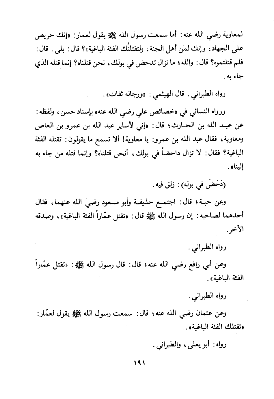 ورواه النسائي في "خصائص علي رضي الله عنه " بإسناد حسن، ولفظه: عن عبد الله بن الحارث؛ قال: "إني لأساير عبد الله بن عمرو بن العاص ومعاوية، فقال عبد الله بن عمرو: يا معاوية ألا تسمع ما يقولون: تقتله الفئة الباغية؟ فقال: لا تزال داحضا في بولك، أنحن قتلناه؟ وإنما قتله من جاء به إلينا".